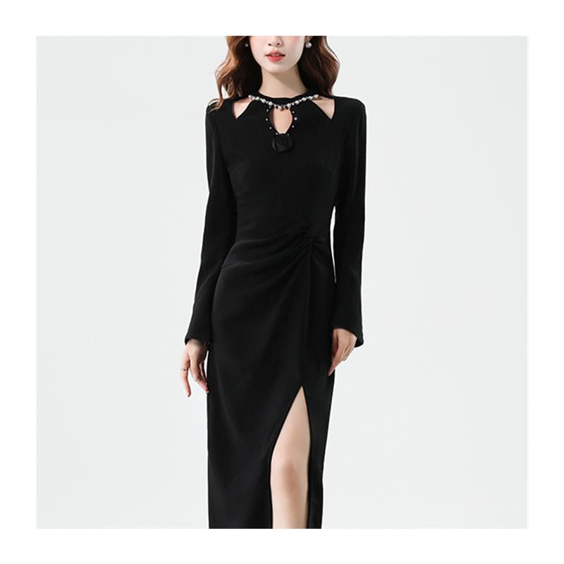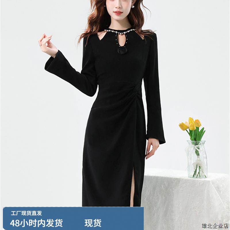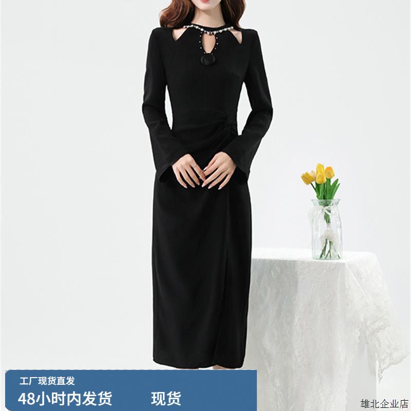 覆古赫本风黑色长袖打底连衣裙女秋冬覆古减龄名媛穿搭修身小黑裙