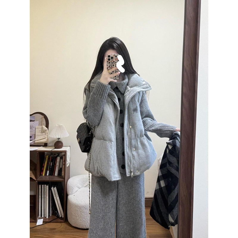 慵懒风立领马甲字母刺绣棉服女+高领开衫毛衣+高腰休闲针织裤套装
