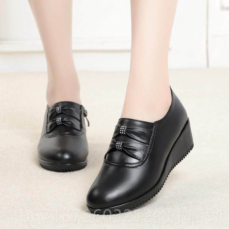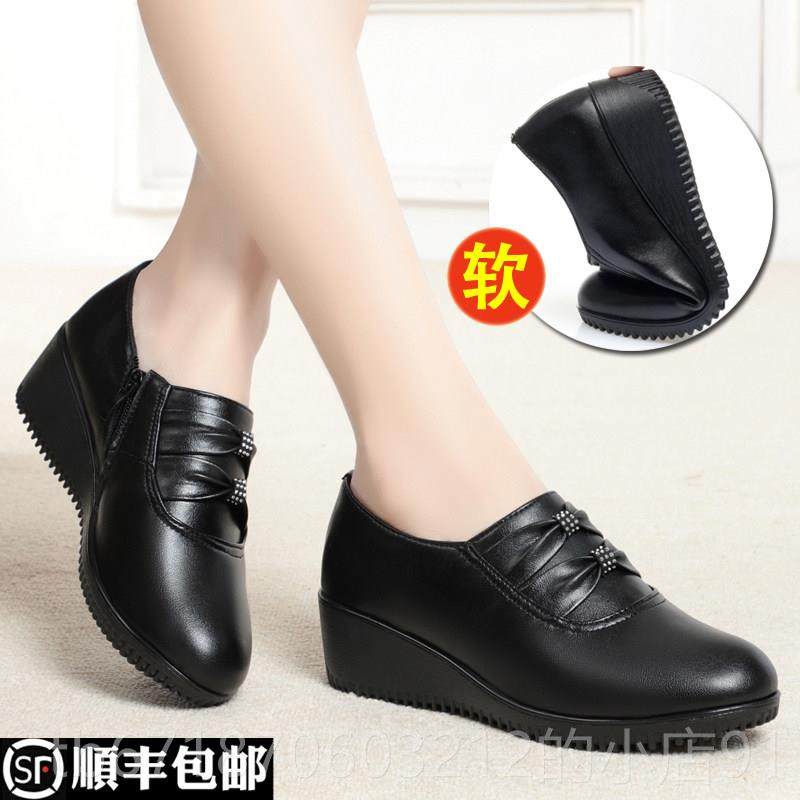 正品妈中年妈坡跟鞋单鞋女春秋鞋适真皮软底防滑中跟舒中皮老年女