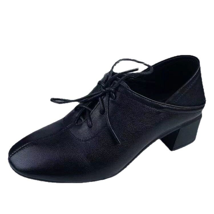 软皮女鞋2026春季新款粗跟系带单鞋黑色皮鞋工作鞋软底软皮妈妈鞋