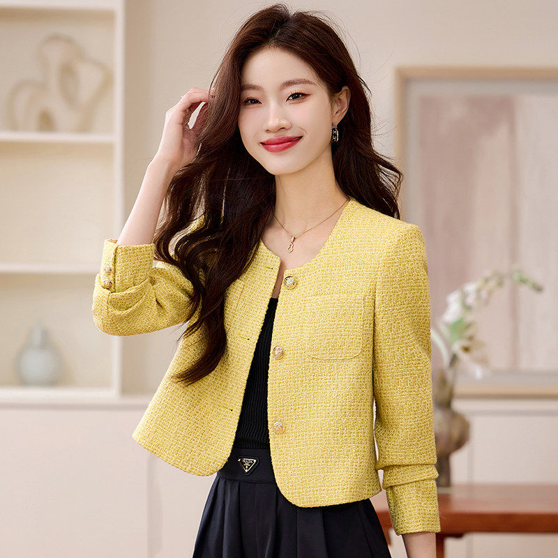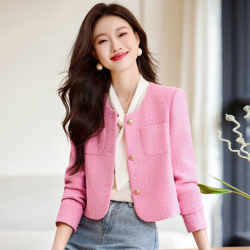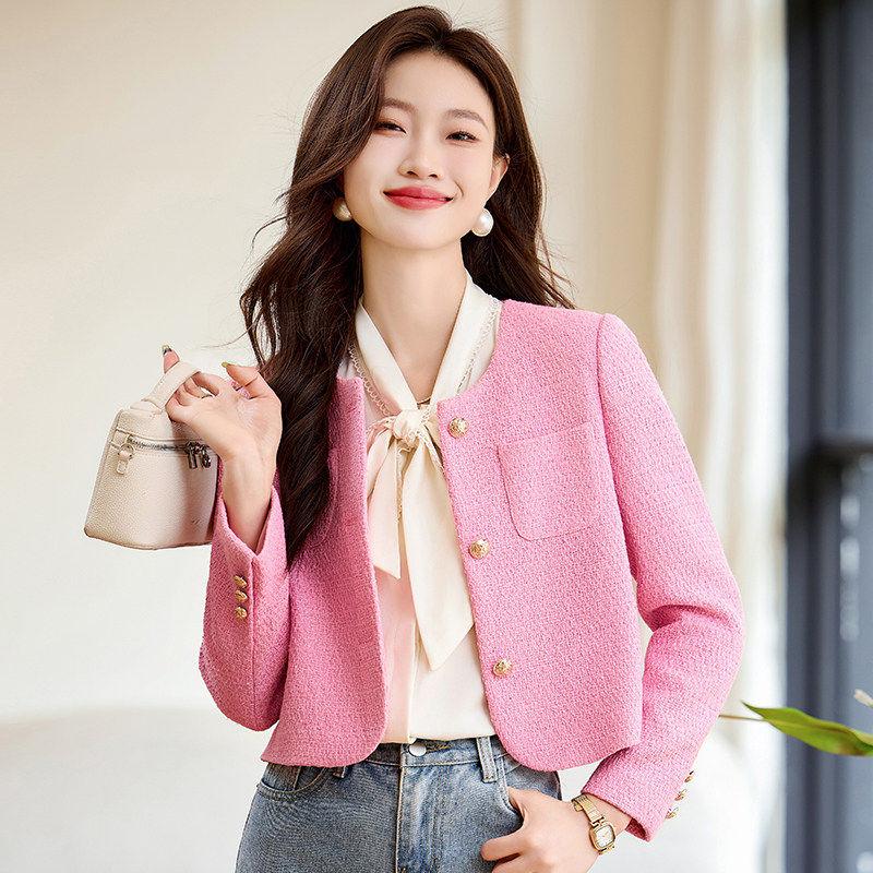 粉色小香风外套春秋法式名媛气质高端粗花呢小个子短款西装上衣女