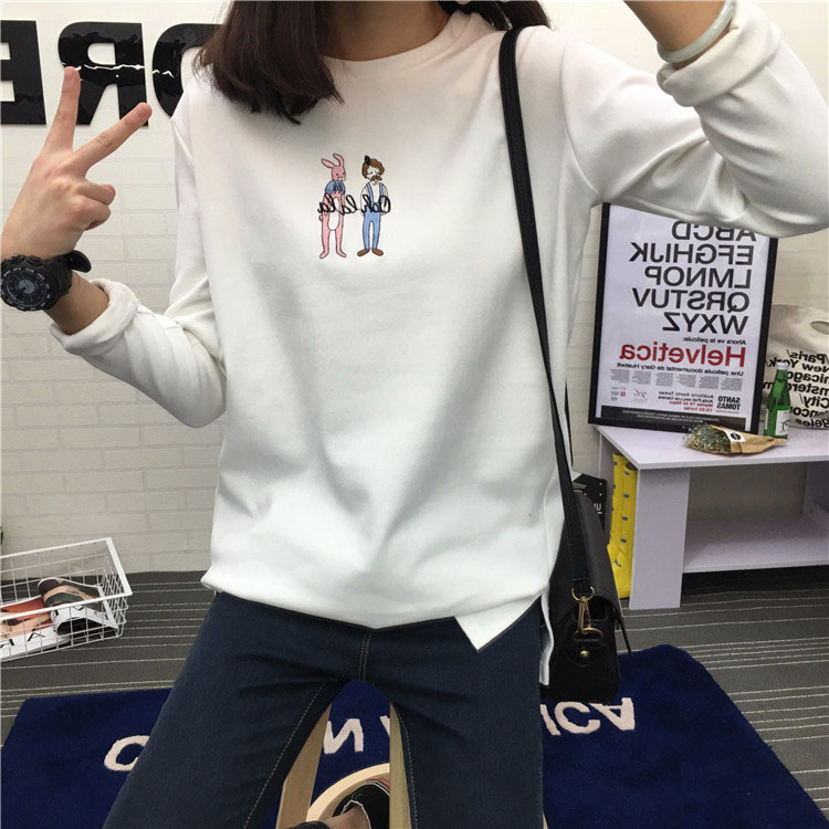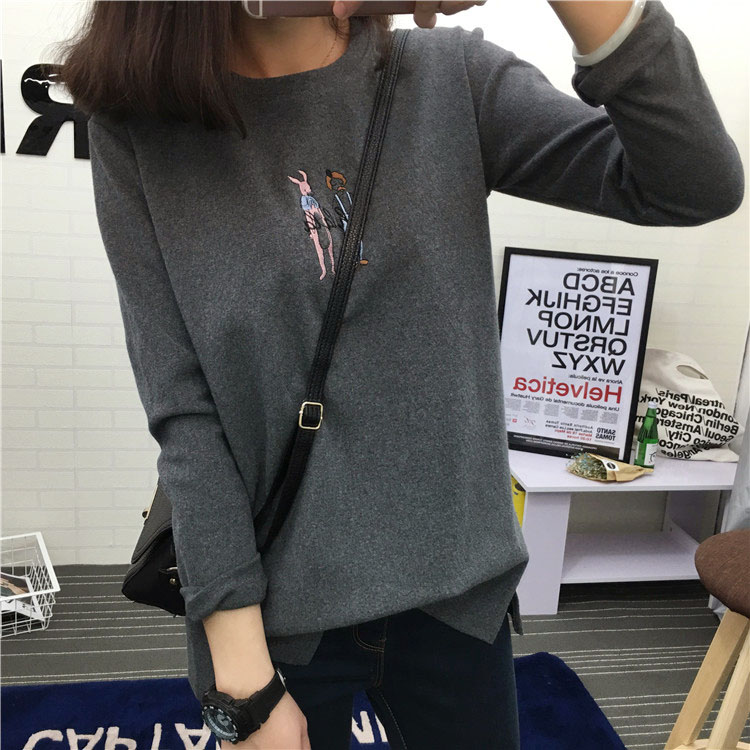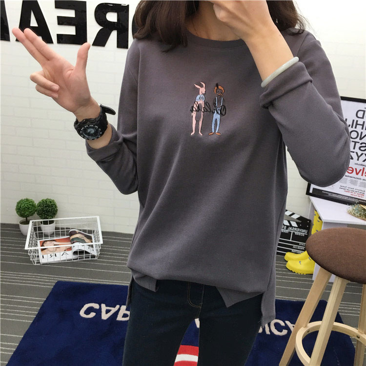 秋冬新款韩版磨毛加厚纯棉卡通刺绣中长款打底衫宽松长袖T恤裙女