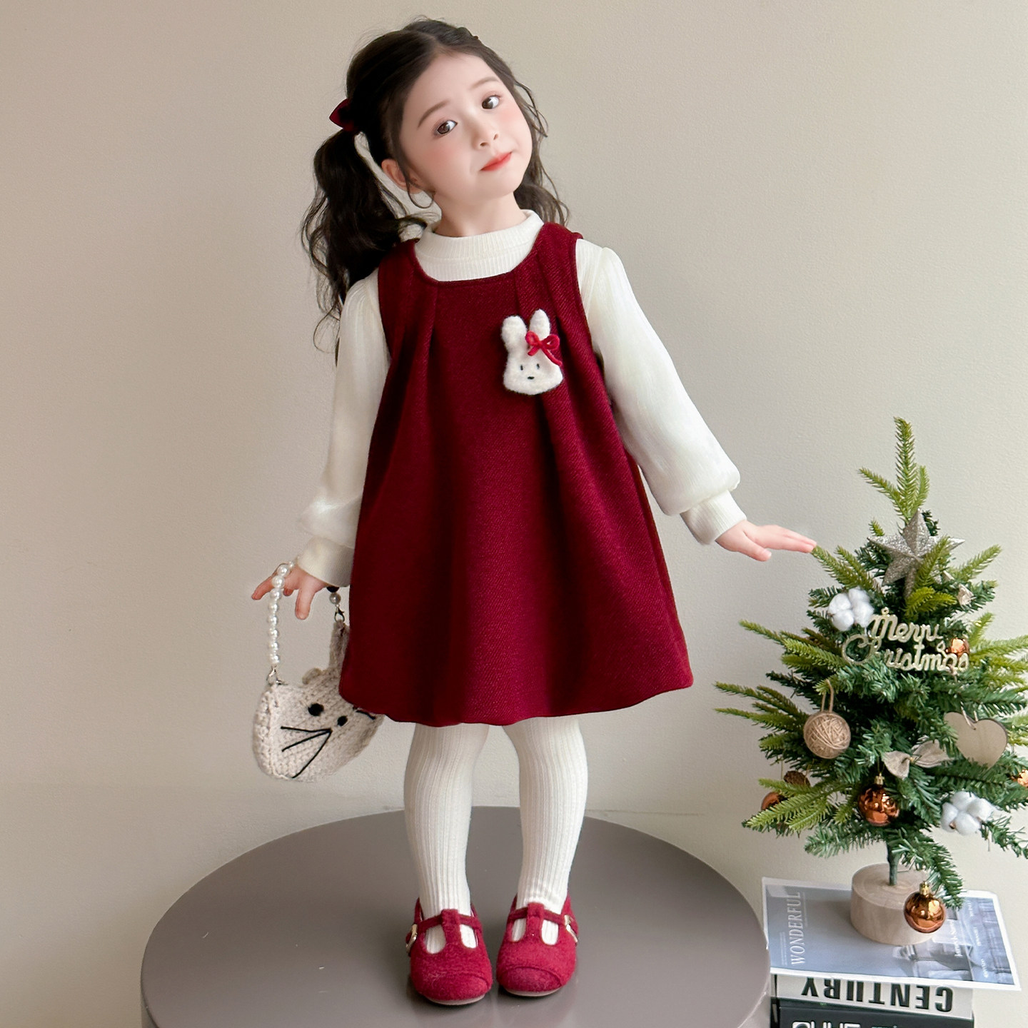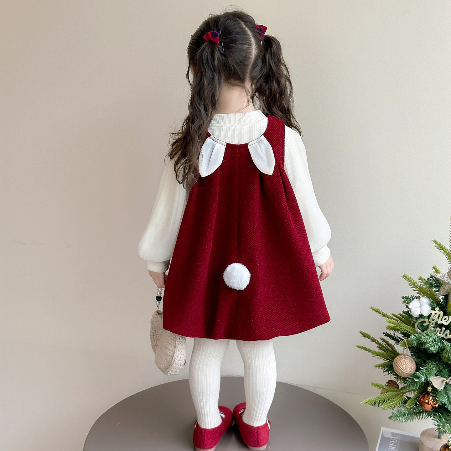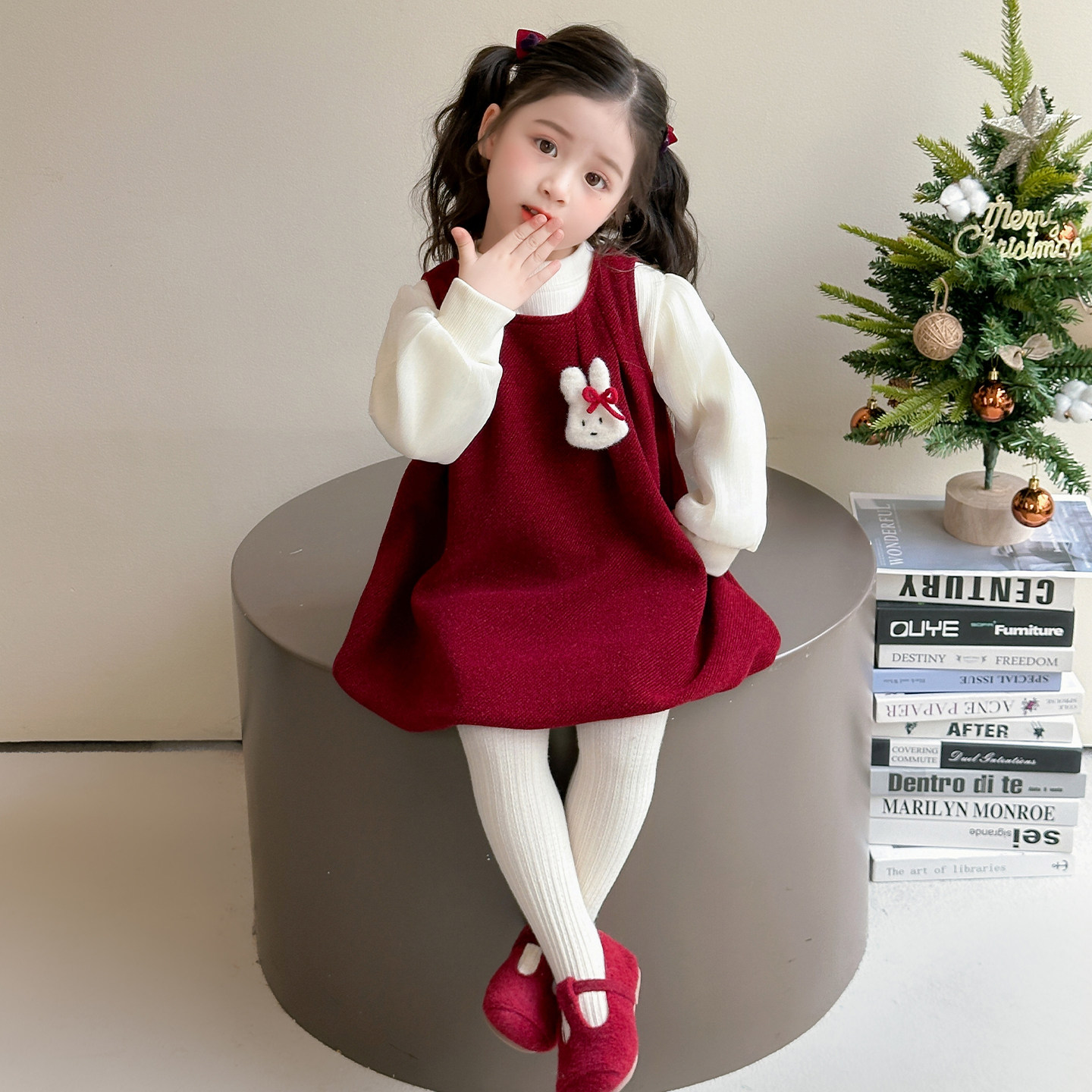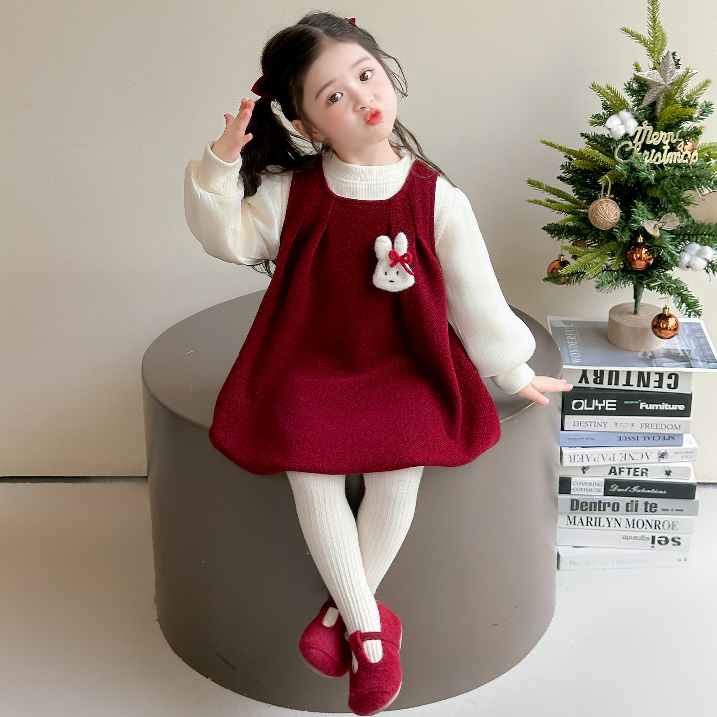 女童连衣裙兔子儿童秋冬季拜年服过年喜庆新年红色女宝宝裙子冬装