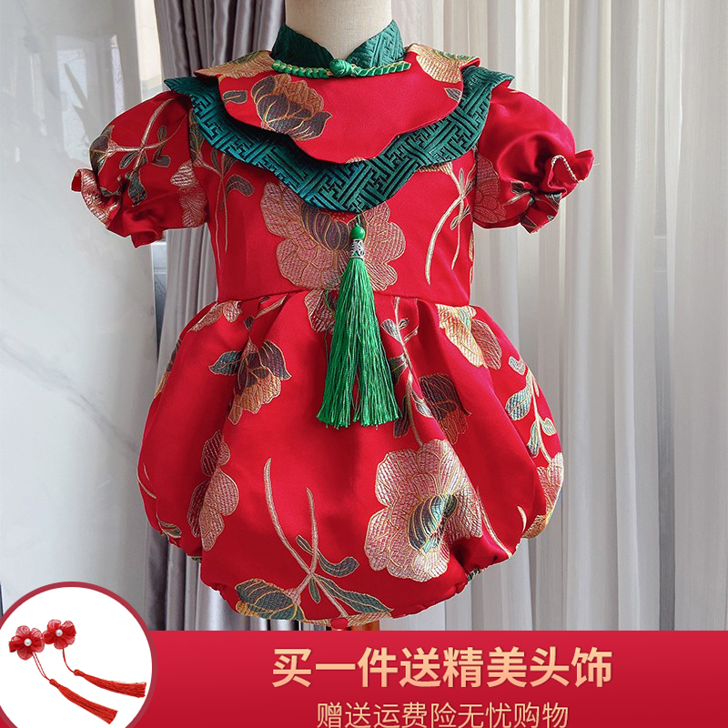 红色一周岁女宝宝礼服汉服女童旗袍中国风唐装中式抓周百日包屁衣