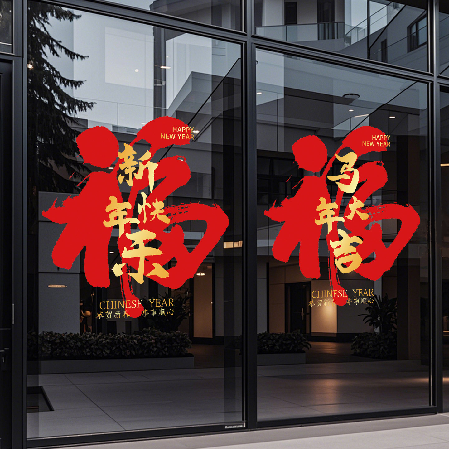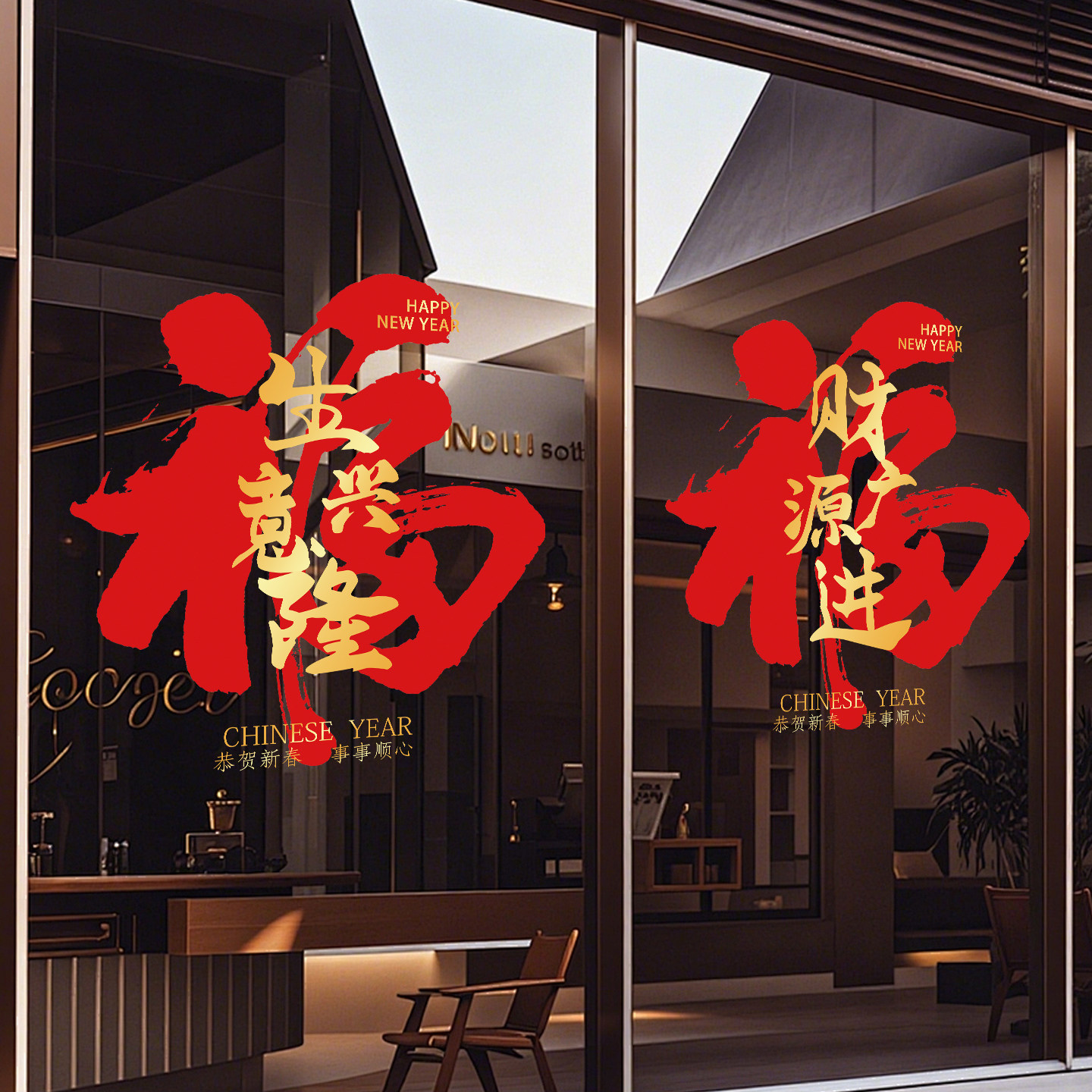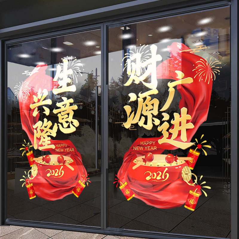 2026新年装饰生意兴隆财源广进玻璃贴纸店铺过年布置马年福字门贴