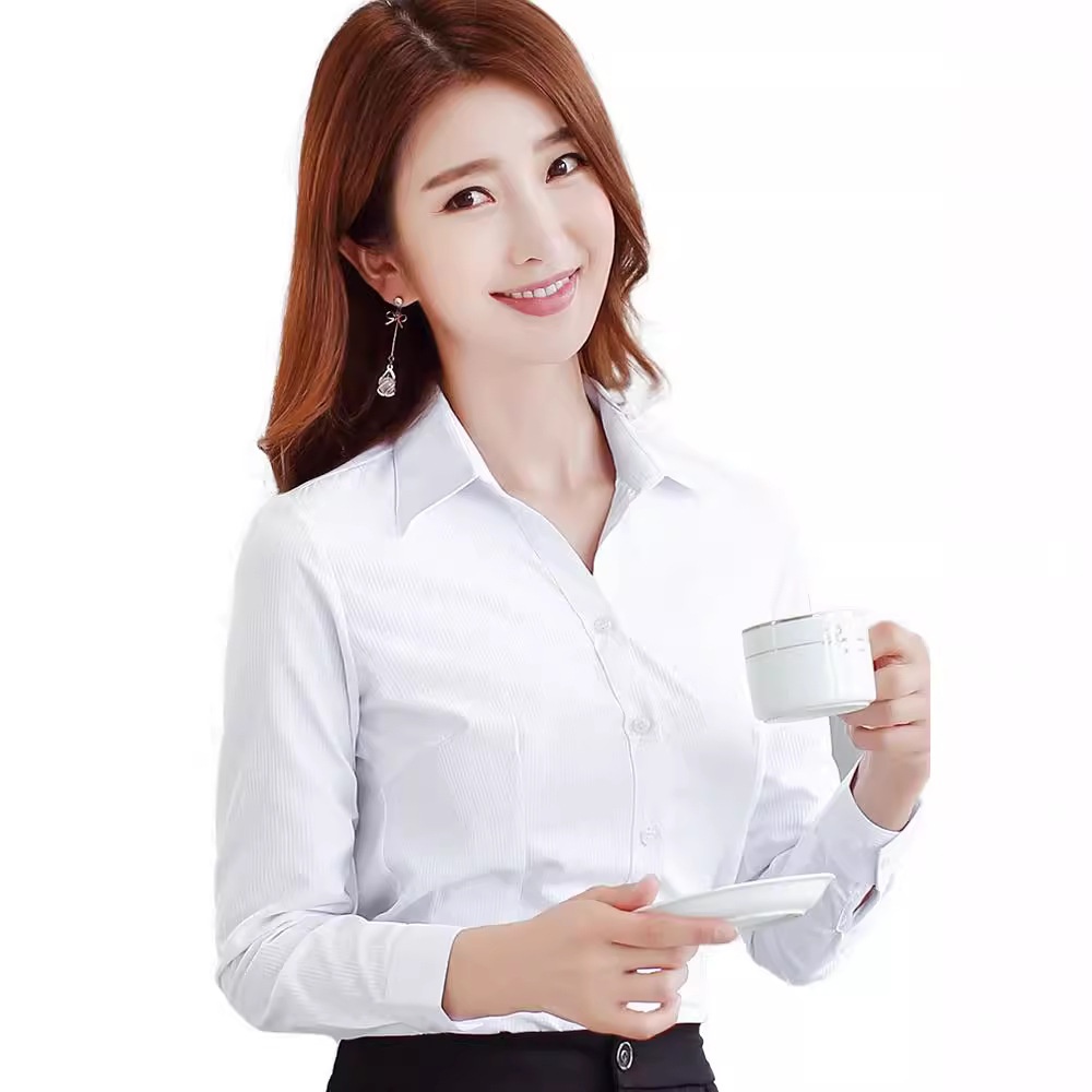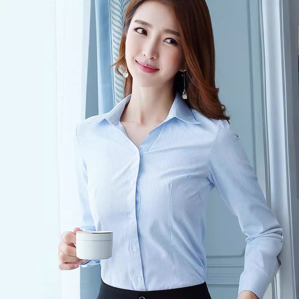 白衬衫女竖纹提花V领长袖新款秋冬修身打底衬衣职业装长袖工作服
