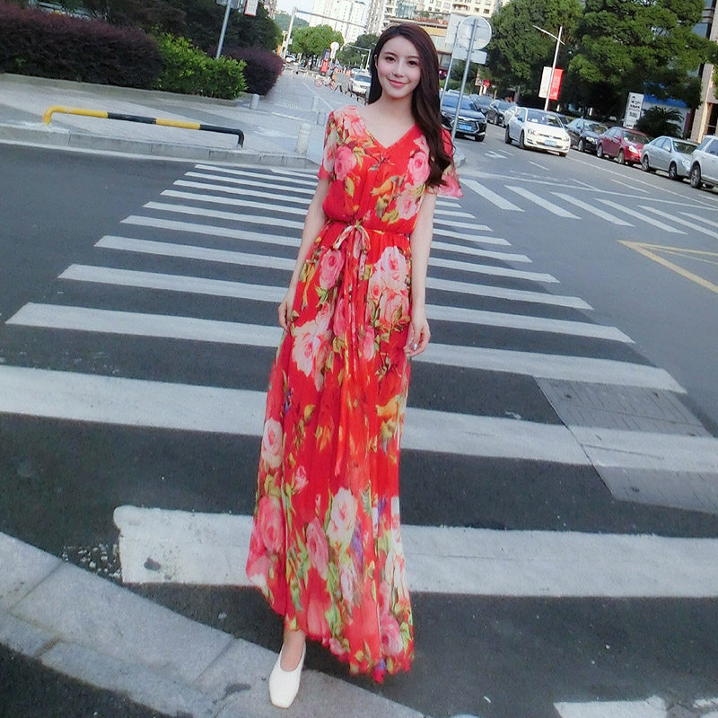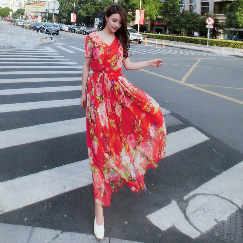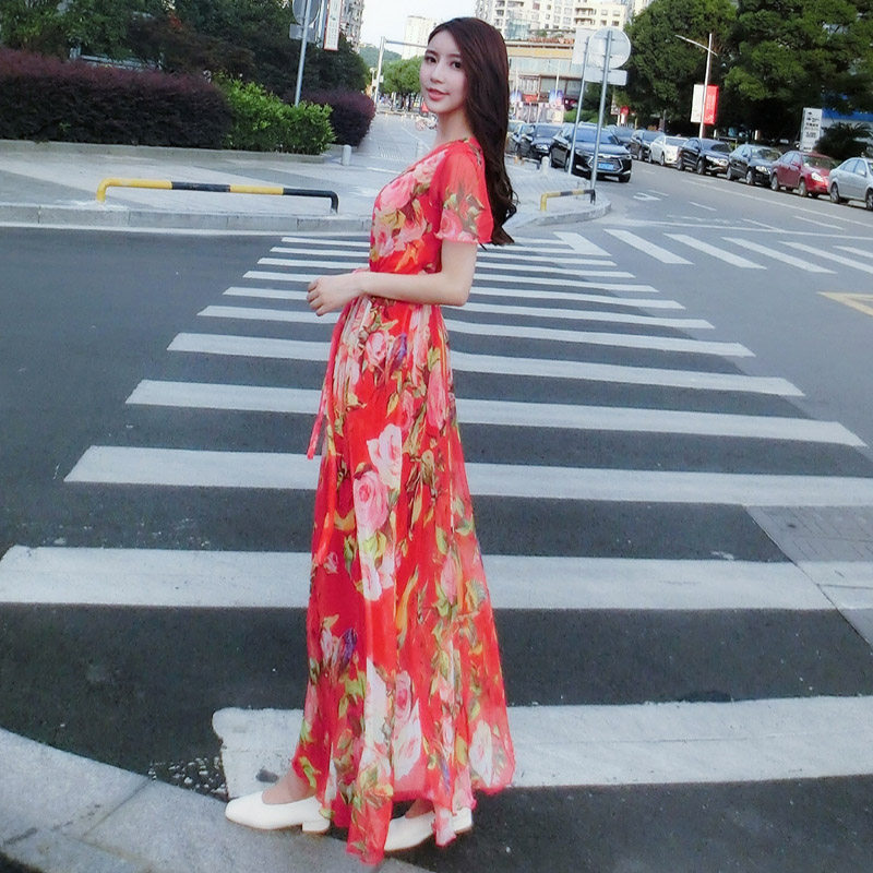 短袖雪纺连衣裙女长裙大码宽松显瘦海边度假沙滩裙碎花裙子
