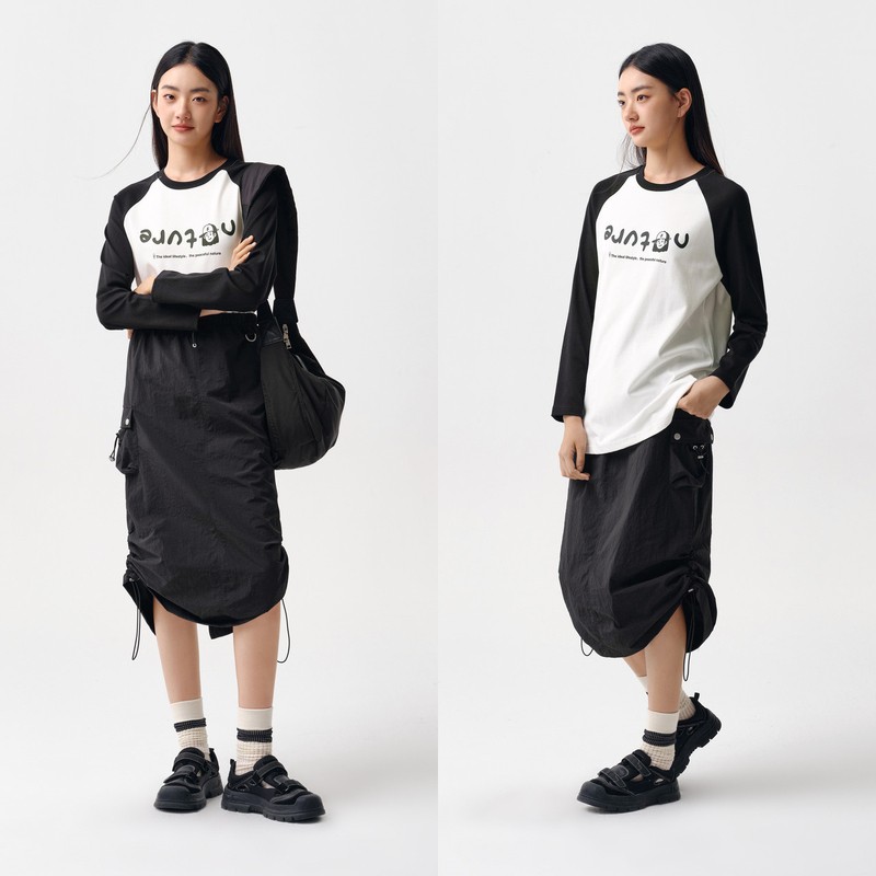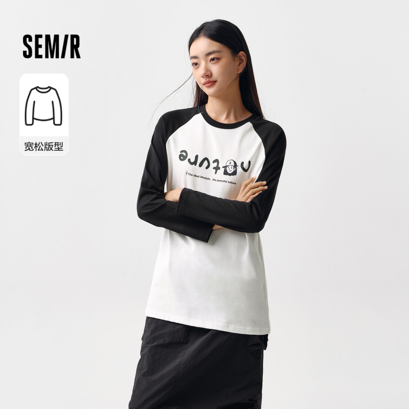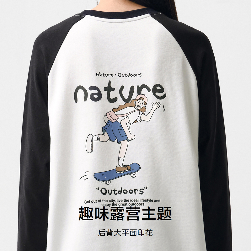 [商场同款]森马长袖T恤女中长款印花插肩袖拼色2024新款宽松春装