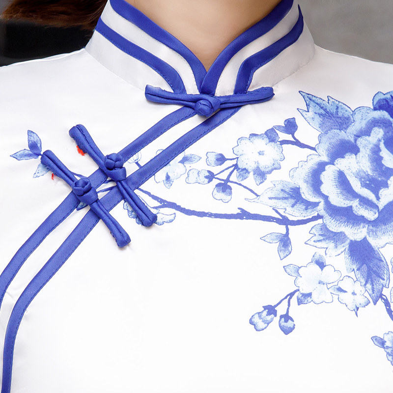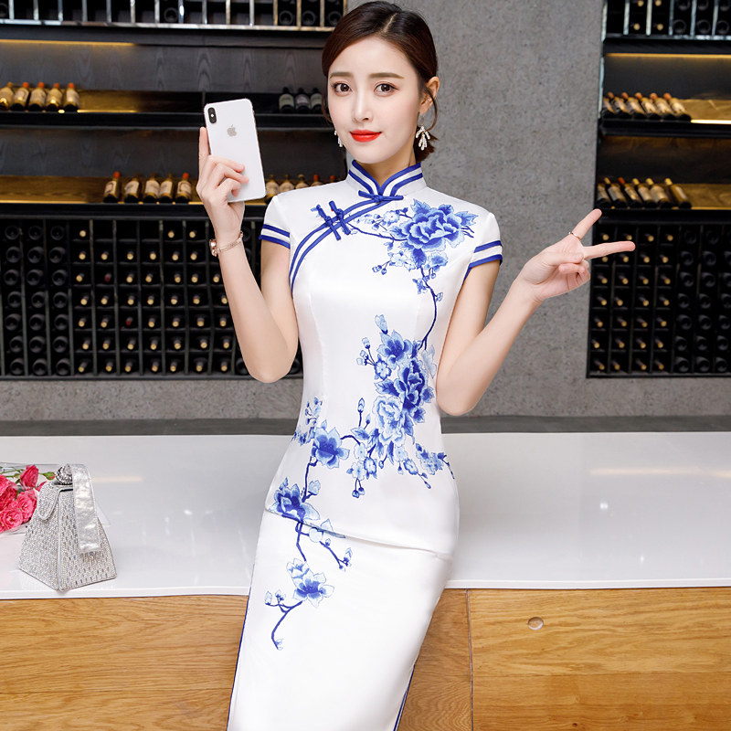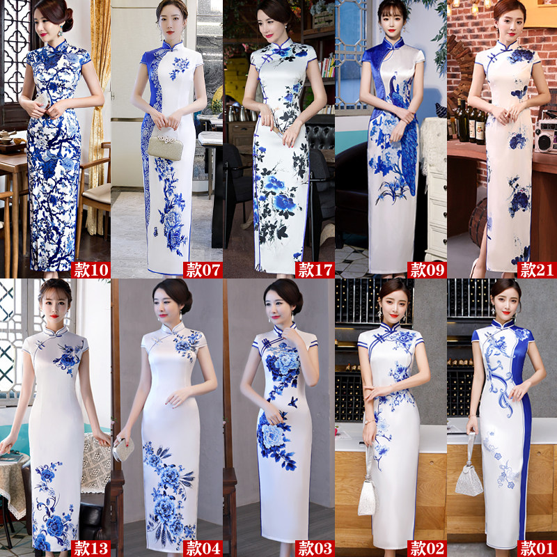 青花瓷旗袍长款复古中国风气质年轻改良连衣裙走秀演出女装加大码