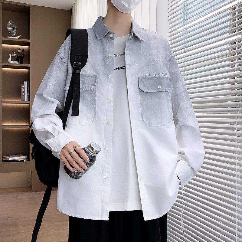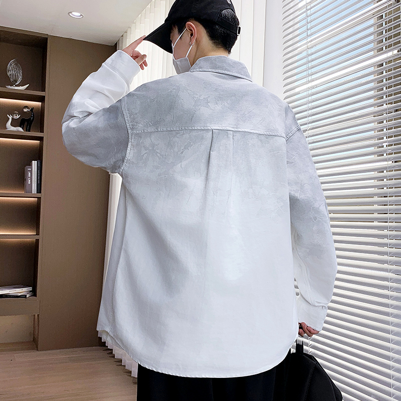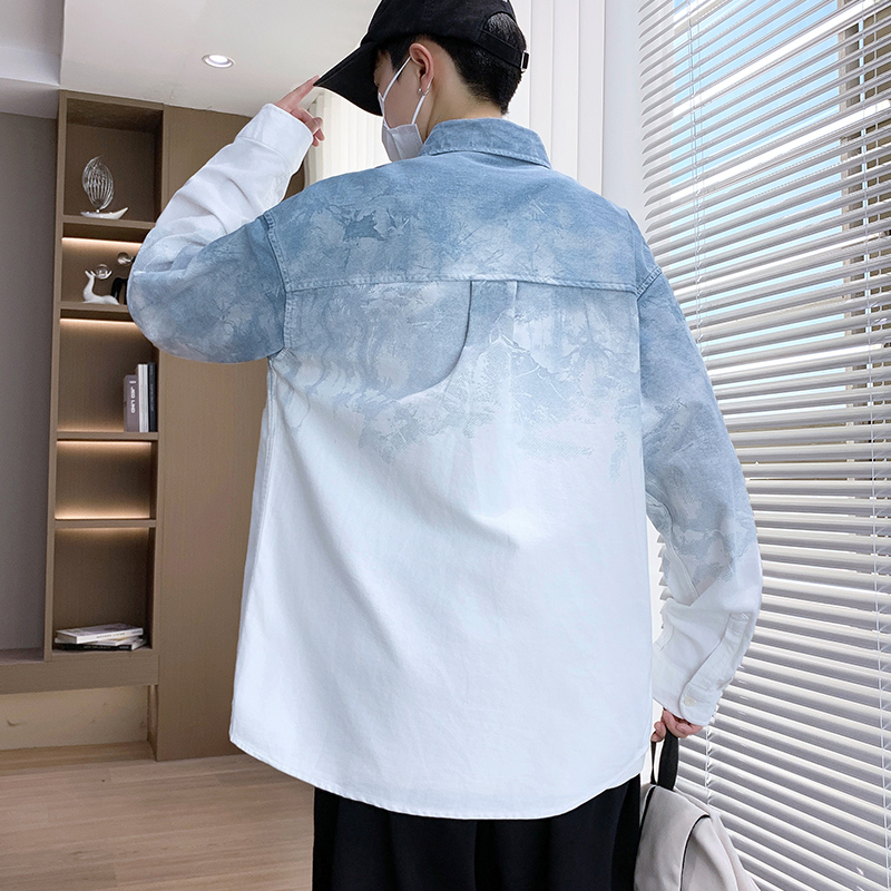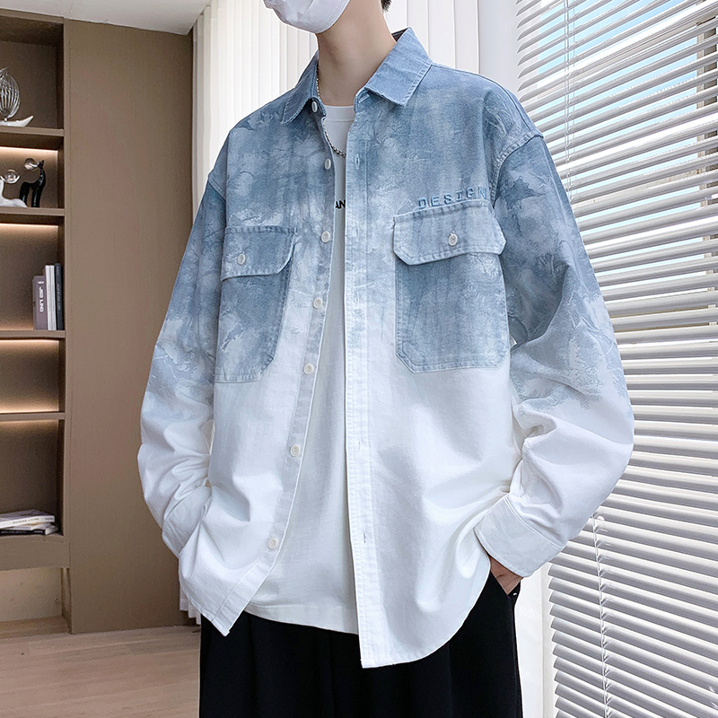 衬衫式长袖外套男春秋季渐变色牛仔工装夹克男款宽松休闲衬衣以純