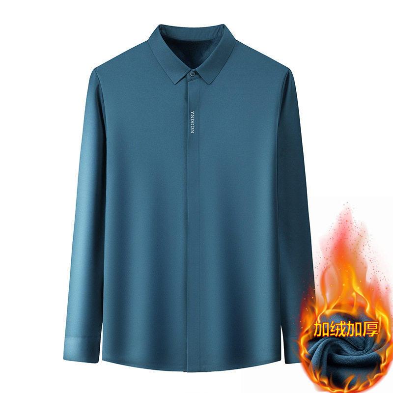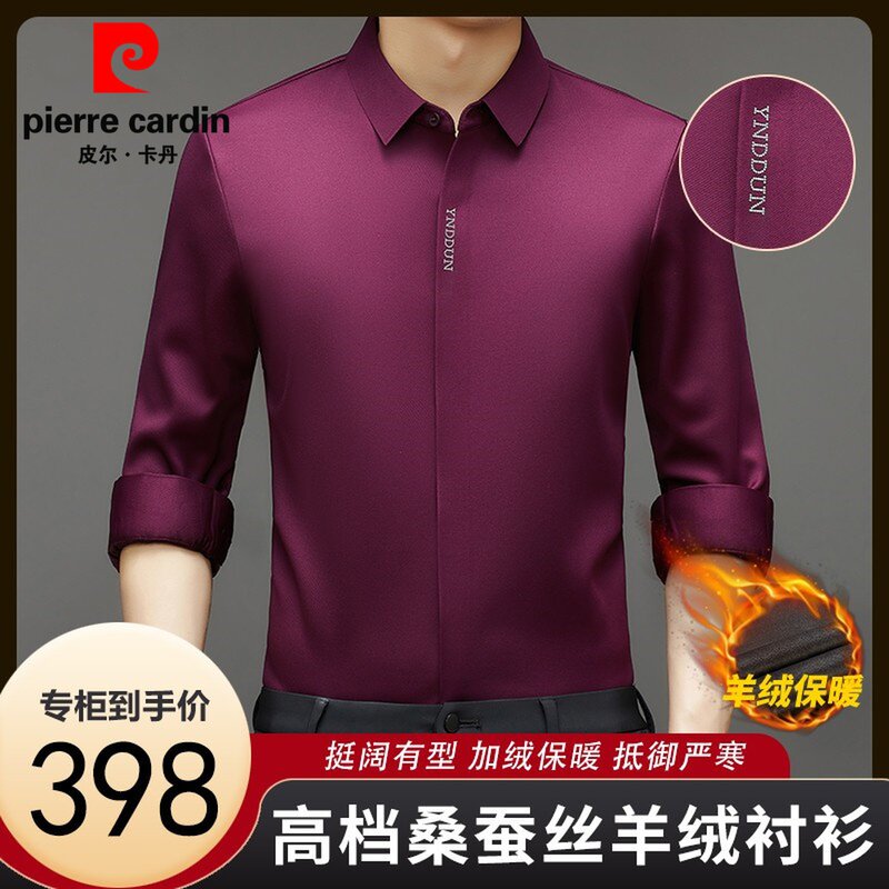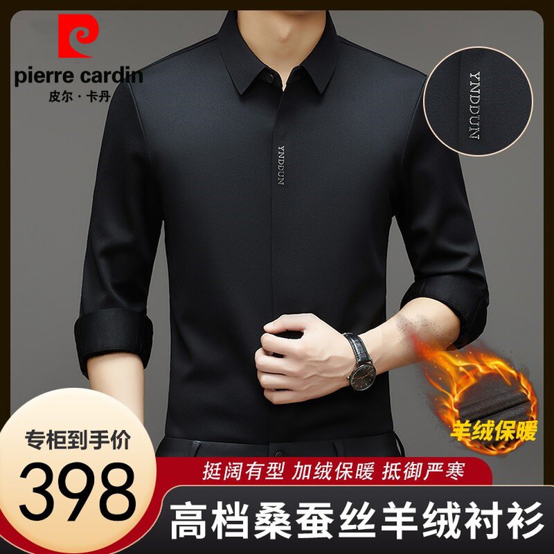 皮尔卡丹秋冬新款桑蚕丝羊绒长袖衬衫男士加厚保暖休闲免烫衬衣男