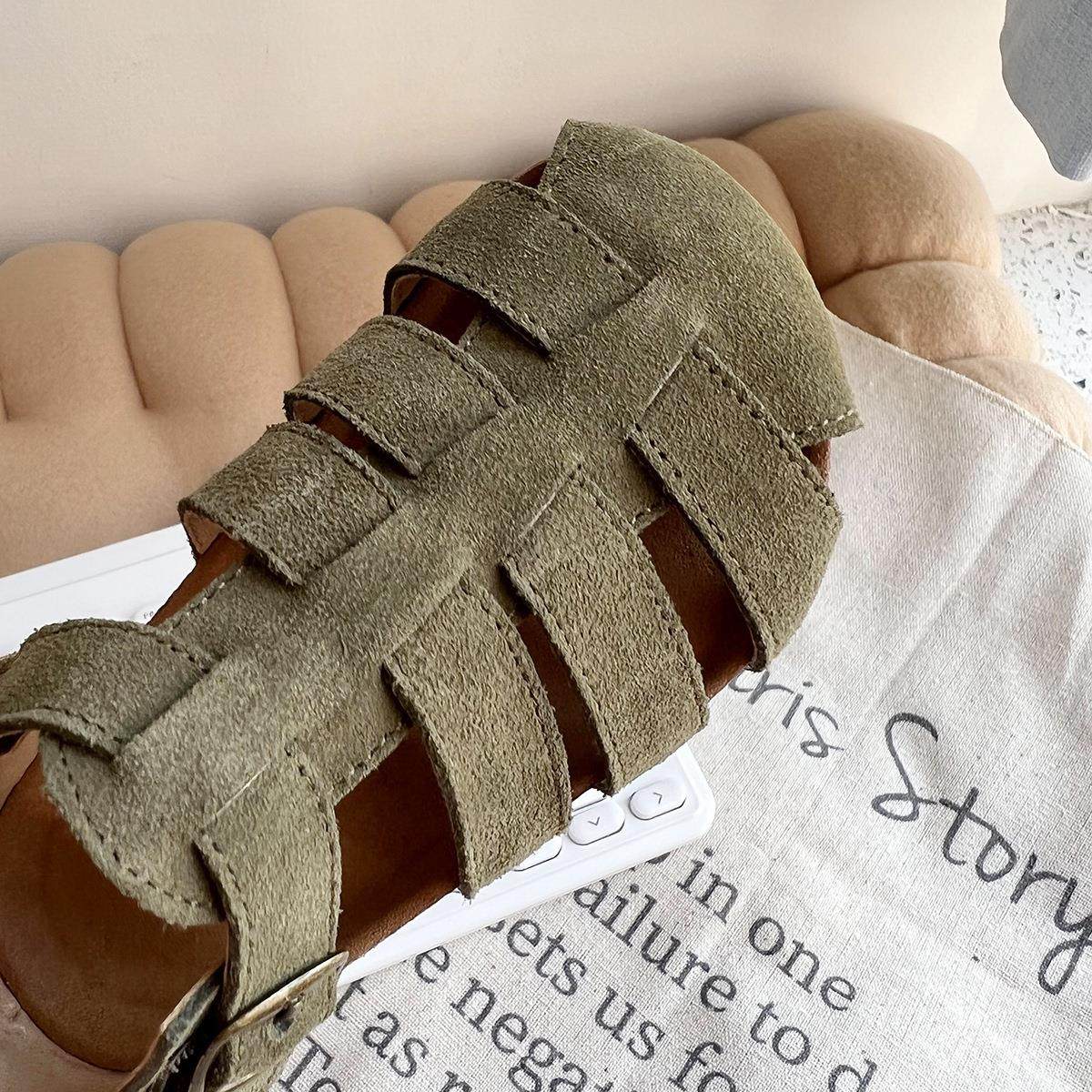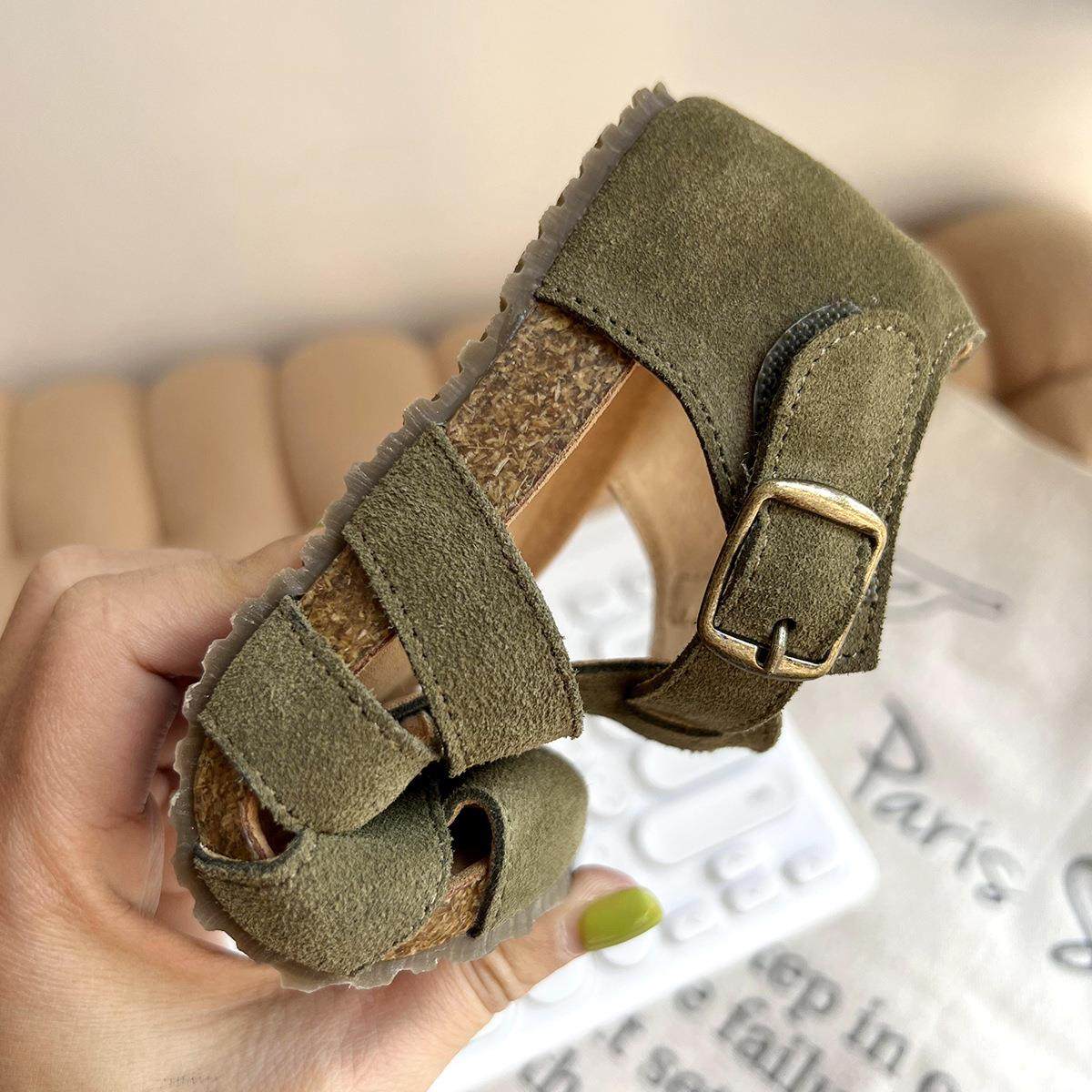 韩国童鞋春夏新款女童包头磨砂真皮凉鞋包脚男童复古英伦豆豆鞋潮