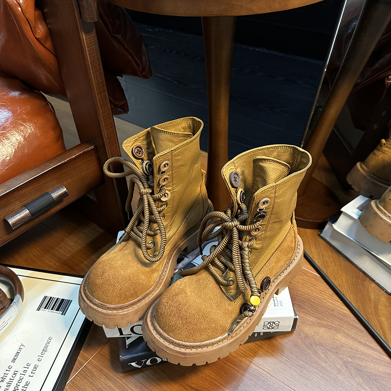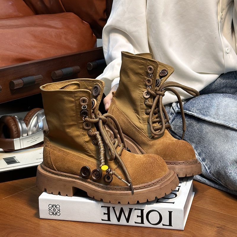 磨砂牛皮做旧擦色厚底马丁靴女2025秋季新款复古真皮系带户外短靴