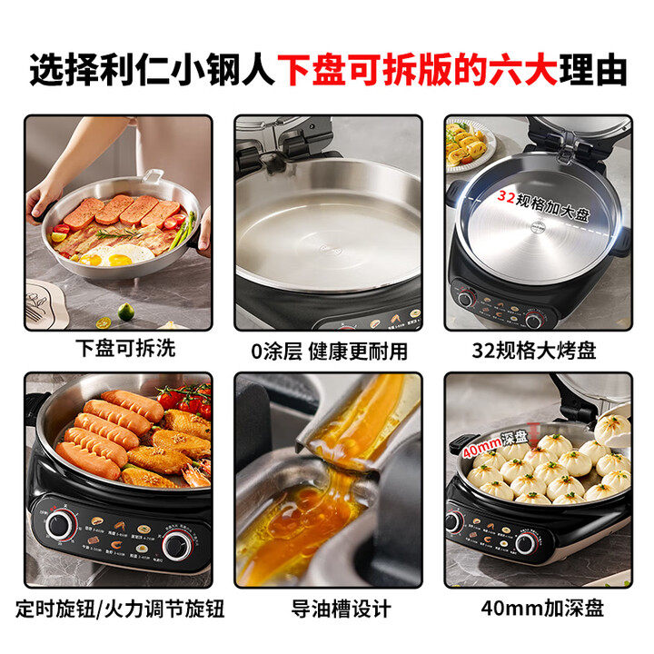 利仁小钢人不锈钢电饼铛0涂层家用双面热加可调节火力烙饼锅新款