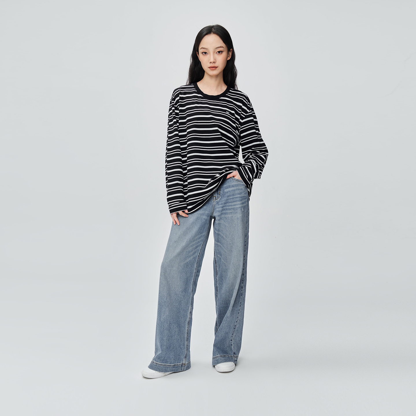 Lee25秋冬新品舒适版圆领小Logo徽标黑色男女同款莱卡条纹长袖T恤