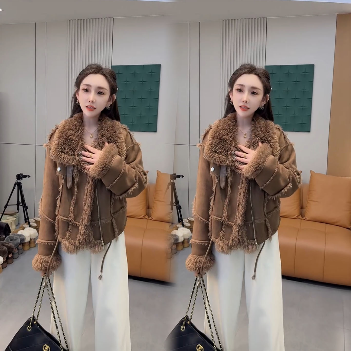 时尚气质纯色翻领加绒仿皮草外套女2025冬季新款宽松减龄保暖大衣