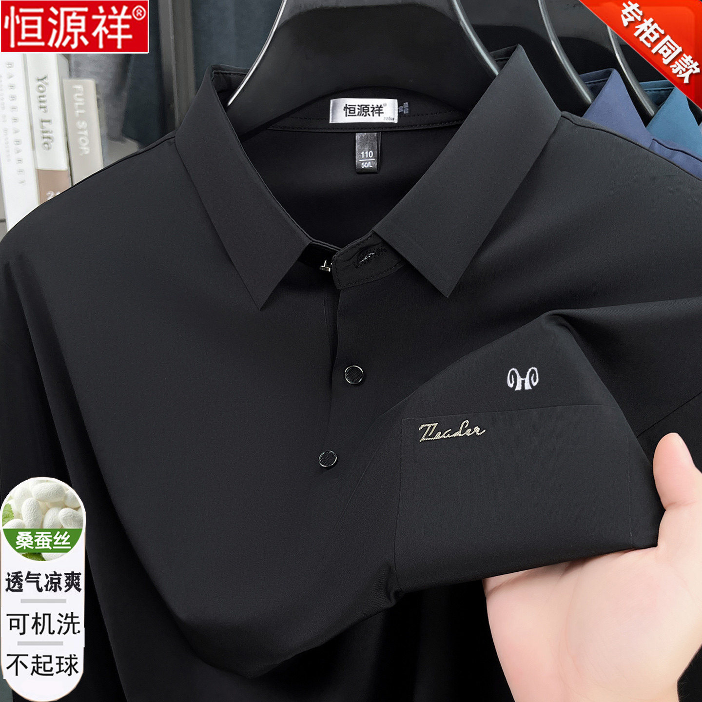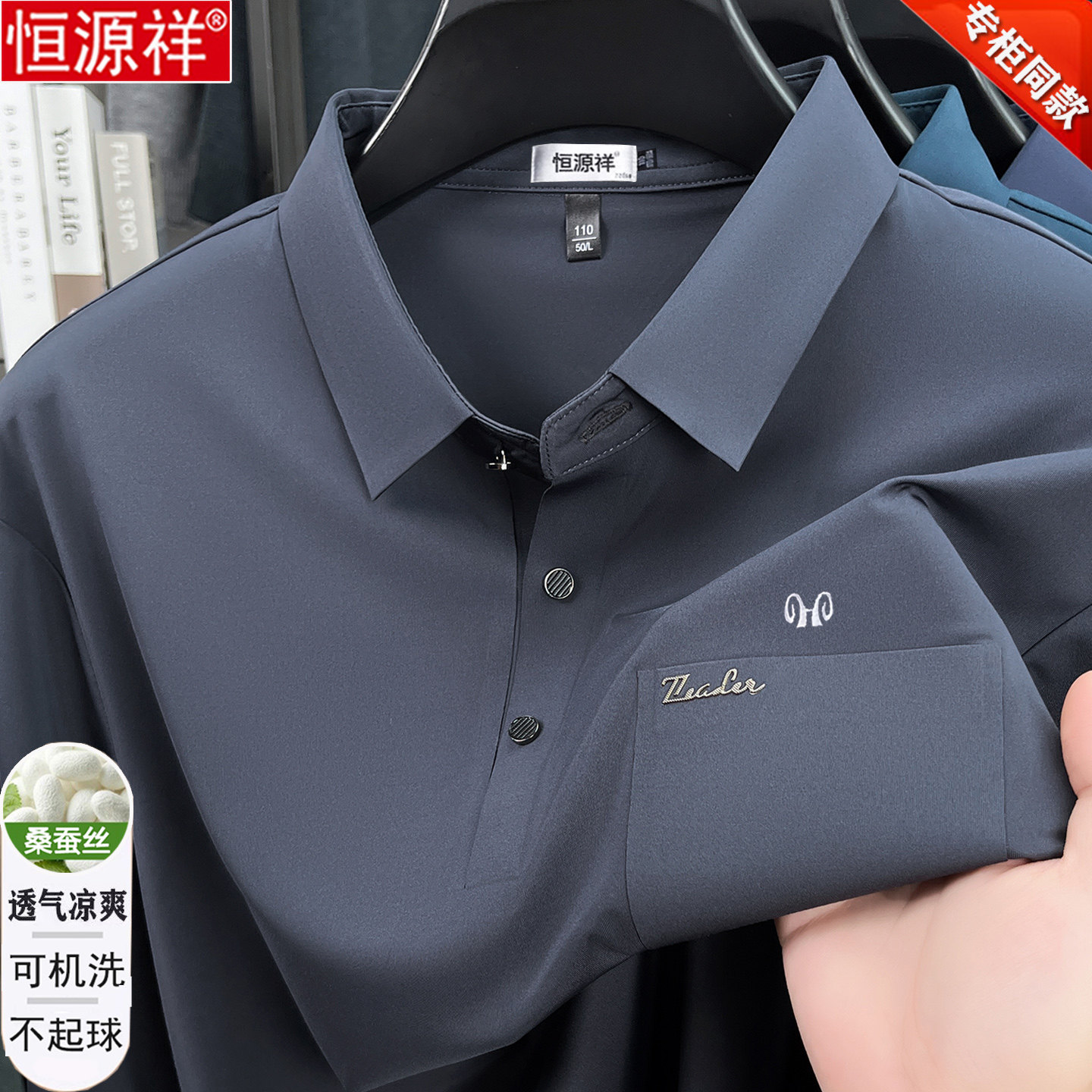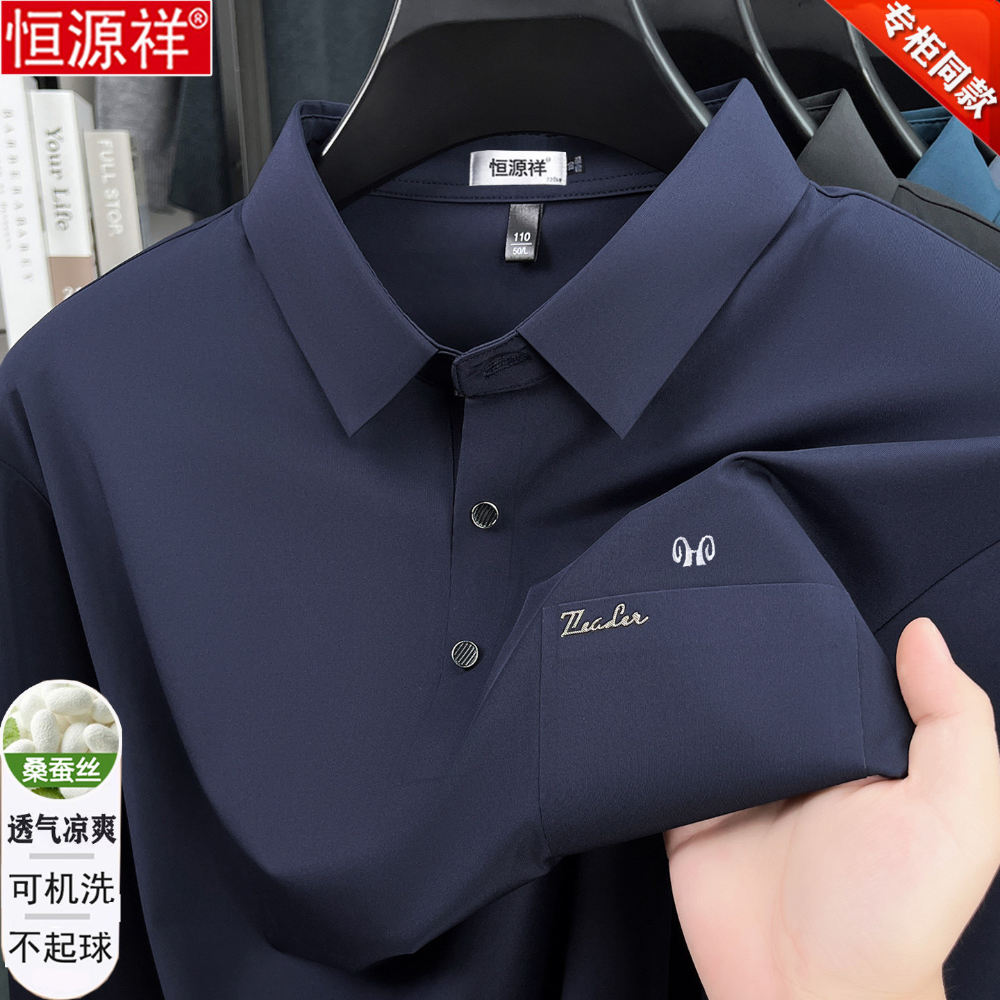 恒源祥桑蚕丝男士长袖t恤中老年翻领爸爸装上衣真口袋打底POLO衫