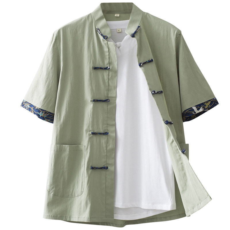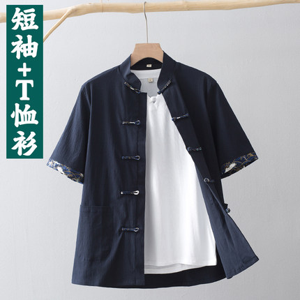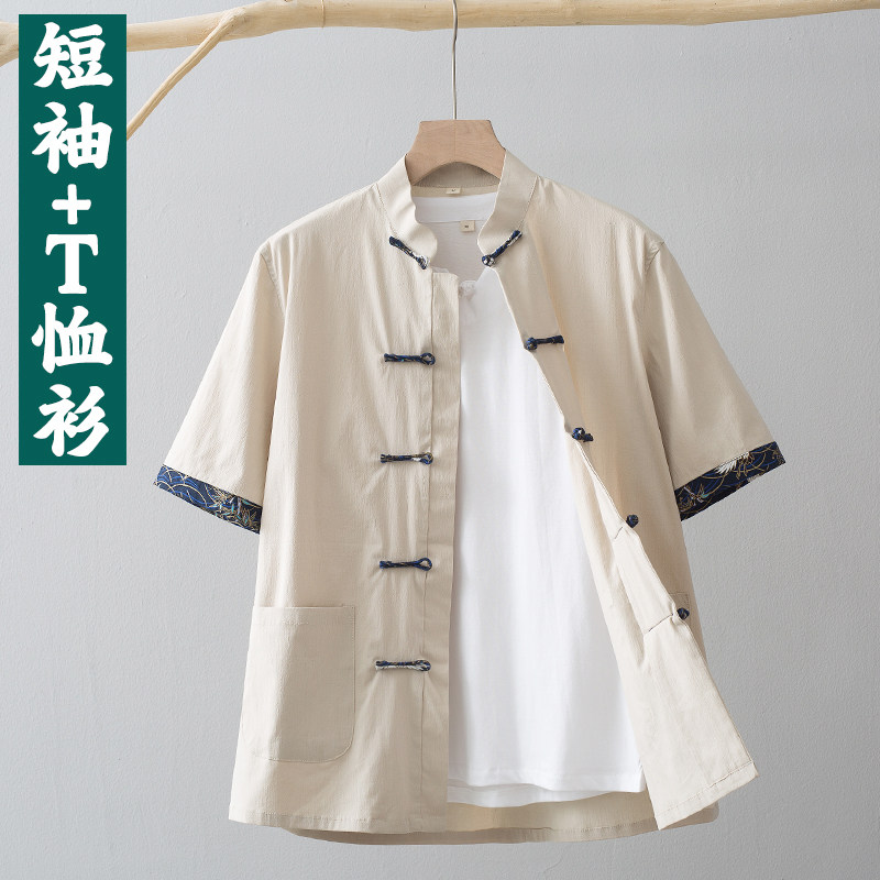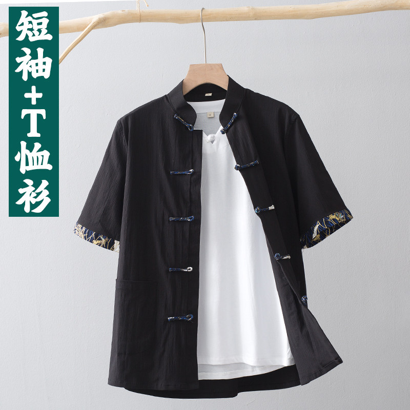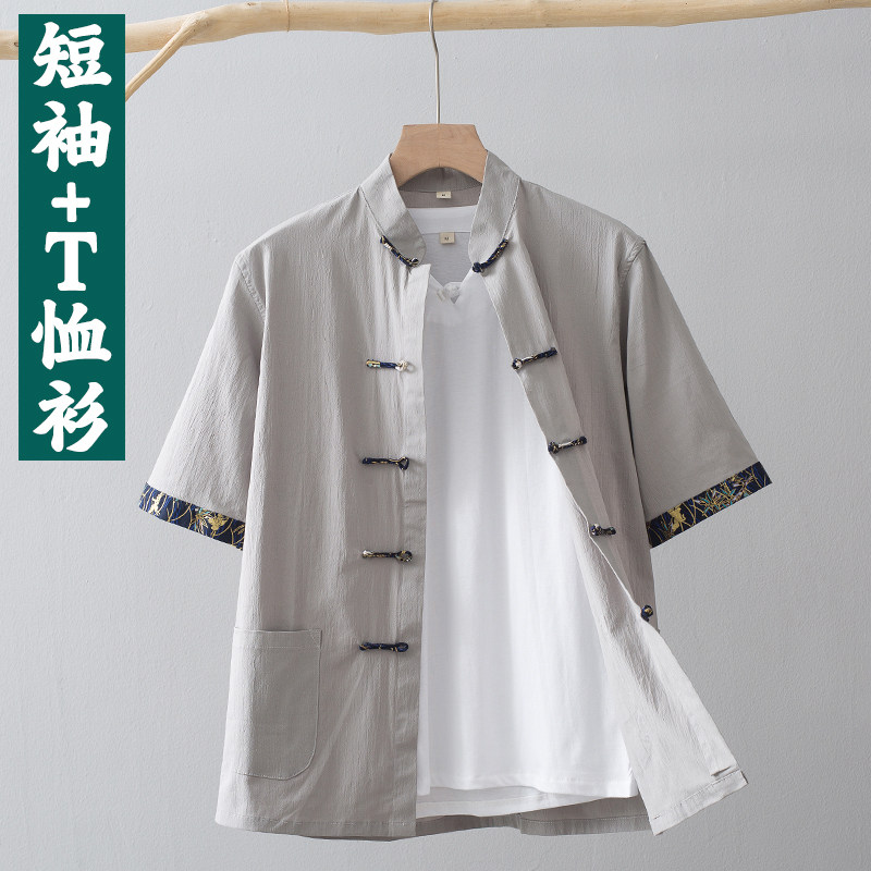 唐装男夏季中式薄款短袖衬衫T恤衫套装青年复古立领休闲盘扣衬衣