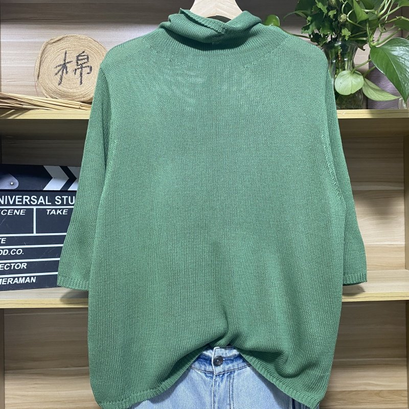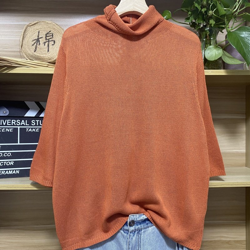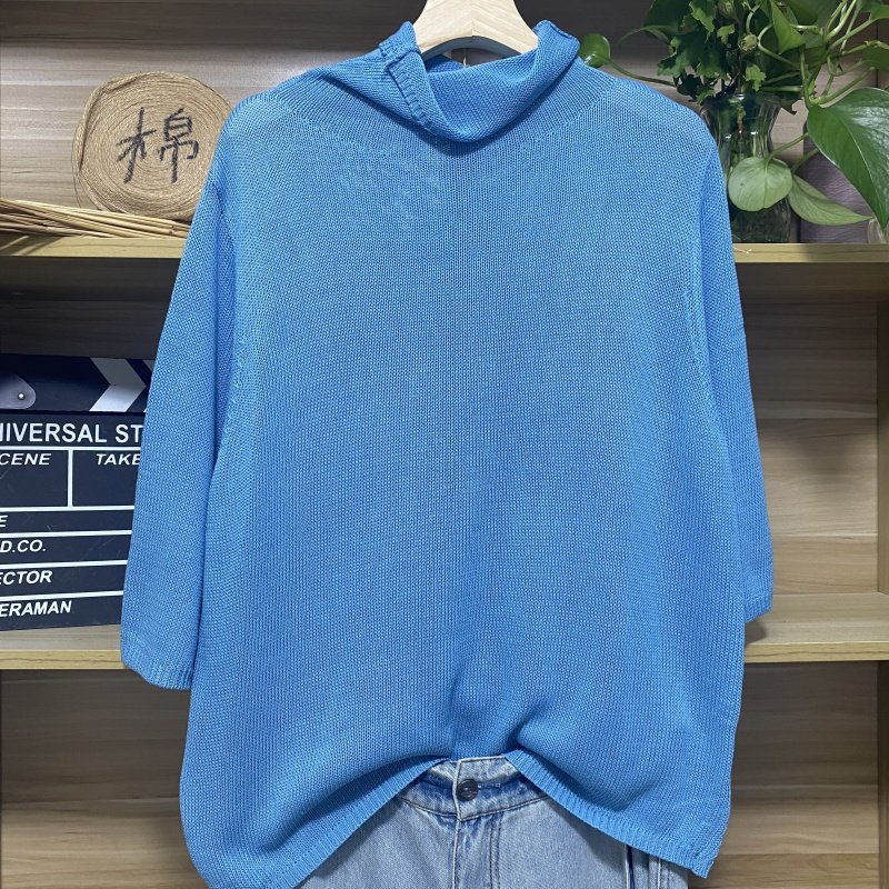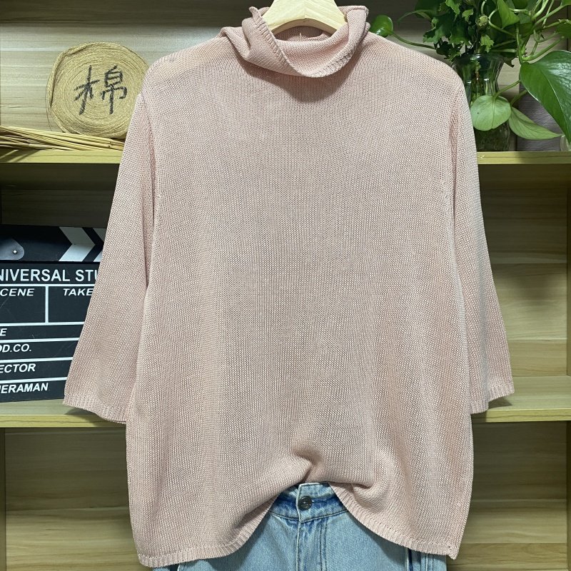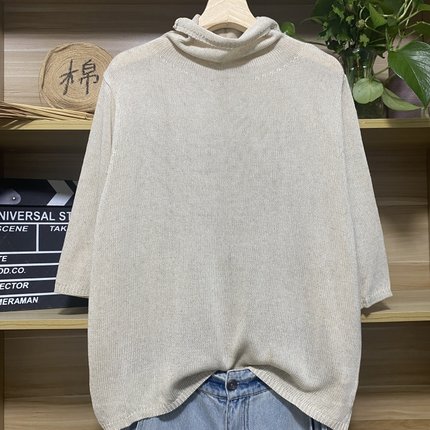 2025秋季新款套头五分袖高领打底衫上衣宽松时尚中袖大码针织衫女