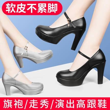 模特走秀高跟鞋女不累脚专用旗袍粗跟真皮跳舞t台中老年演出舞蹈