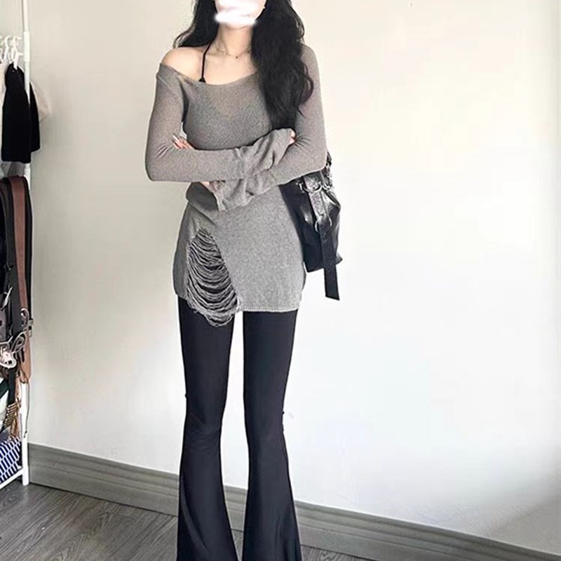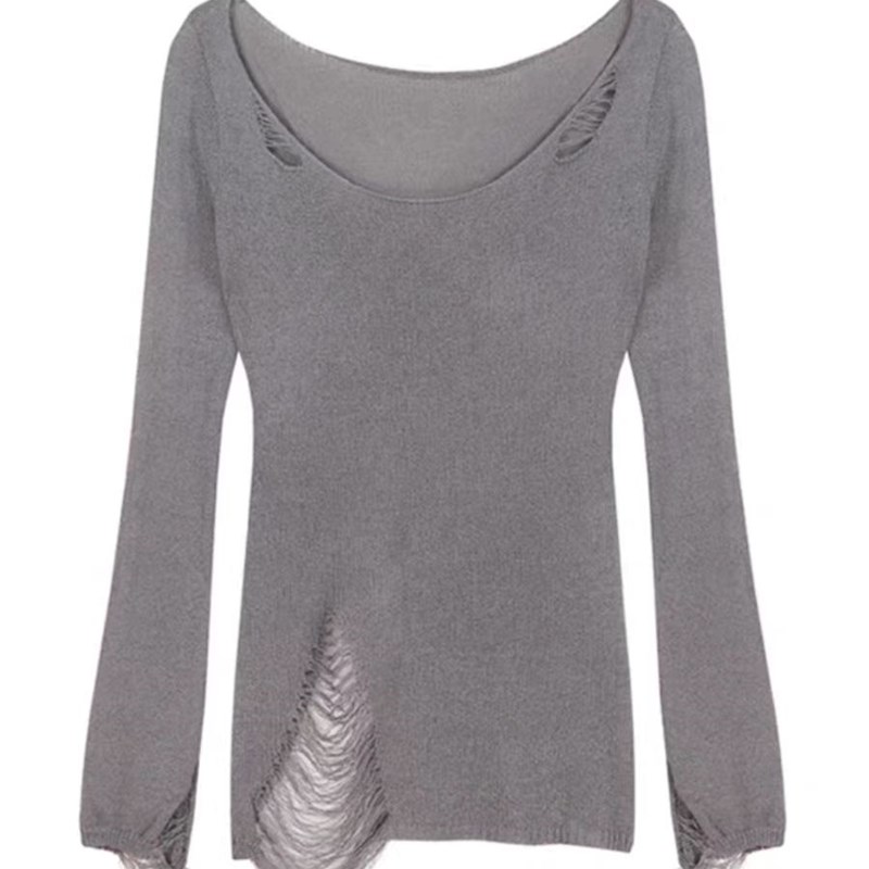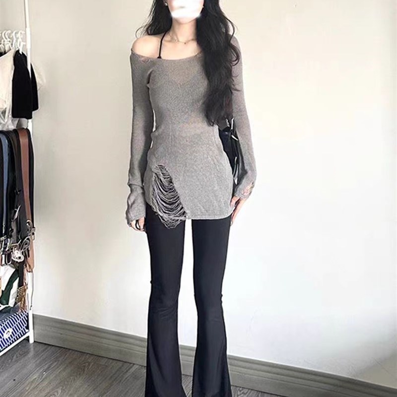 灰色长袖破洞针织T恤女夏季薄款大码防晒罩衫气质高级感露肩上衣
