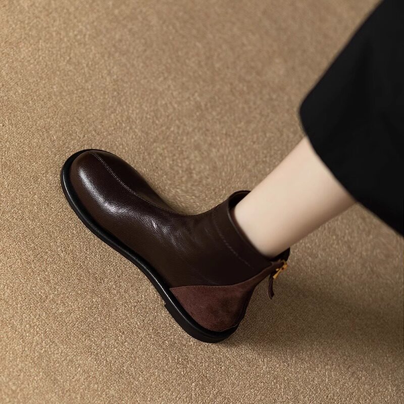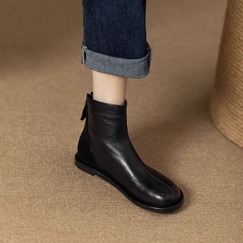 巨舒适黑色法式复古真皮软平底短靴女秋冬加绒英伦风后拉链小踝靴