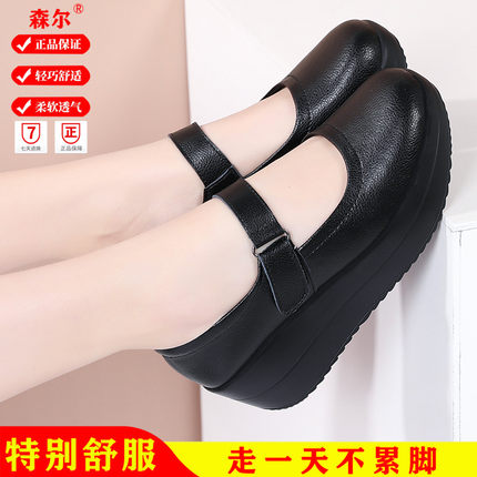 真皮中跟女单鞋厚底摇摇鞋浅口广场舞鞋工作鞋妈妈软底舒适春秋款