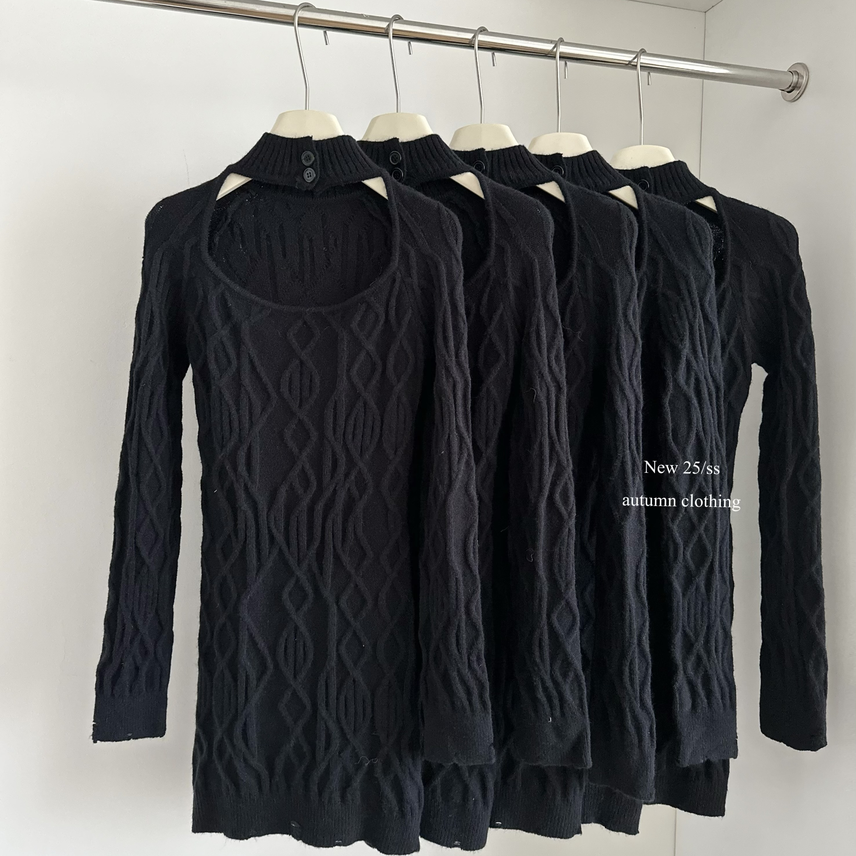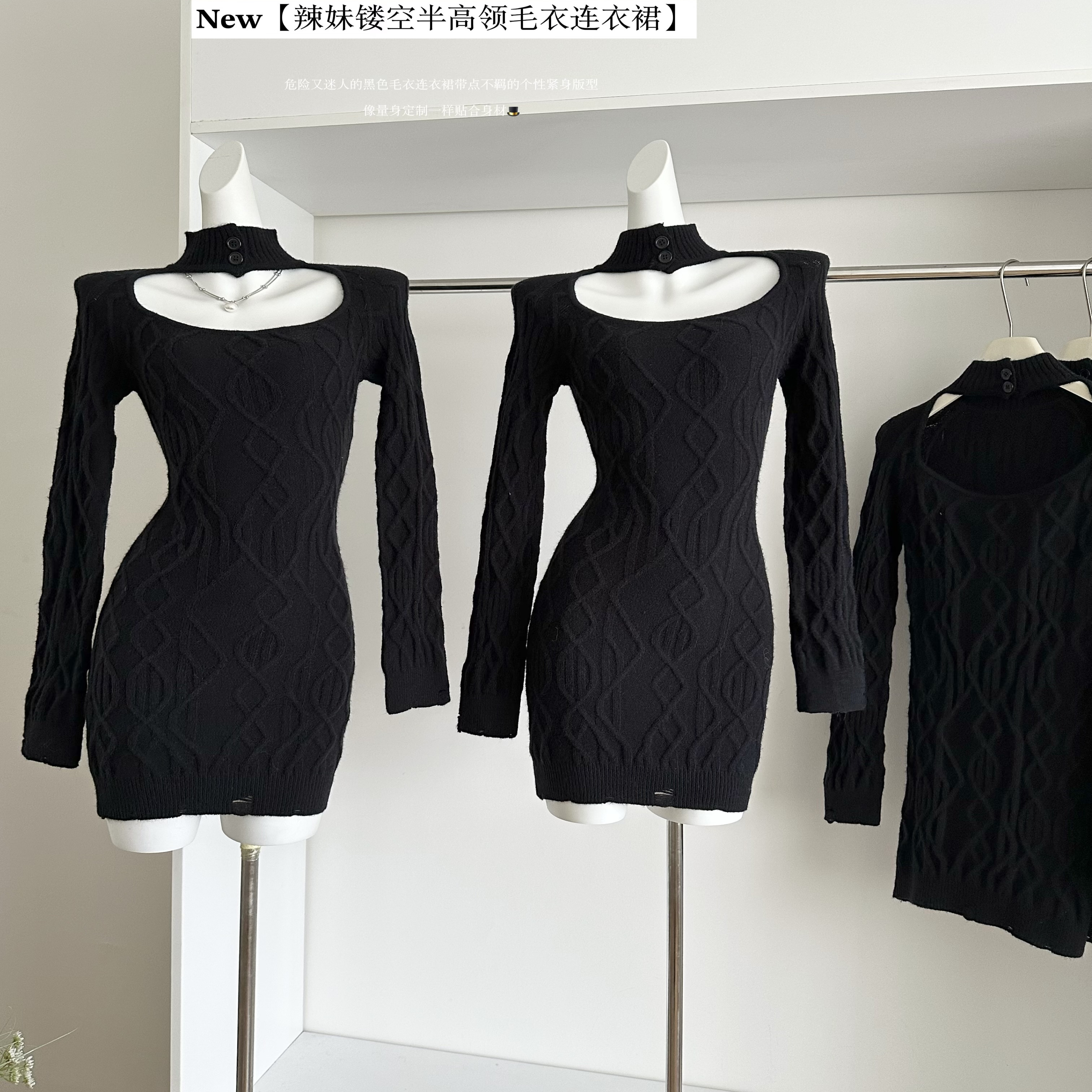 黑色镂空长袖毛衣连衣裙女装秋冬修身高弹力针织包臀短裙打底裙子