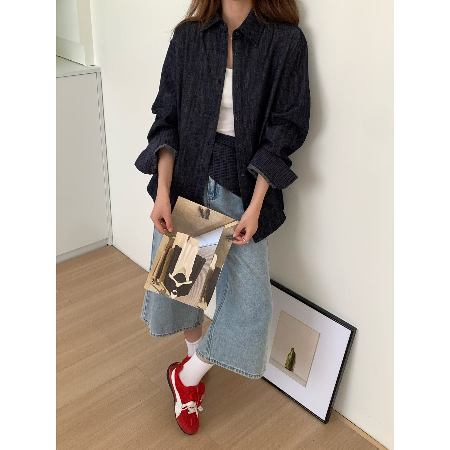 可拆格子披肩牛仔衬衫2025秋款全棉两件套韩版宽松显瘦长袖衬衣女
