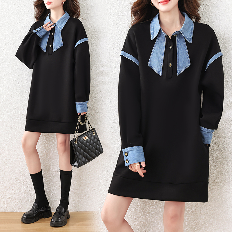 牛仔拼接设计感小众卫衣裙子女秋冬新款宽松减龄中长款休闲连衣裙