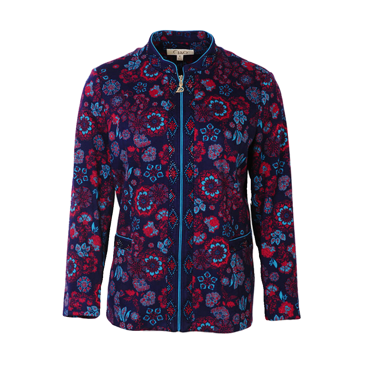 千瑶色织拉链立领烫钻毛针织外套