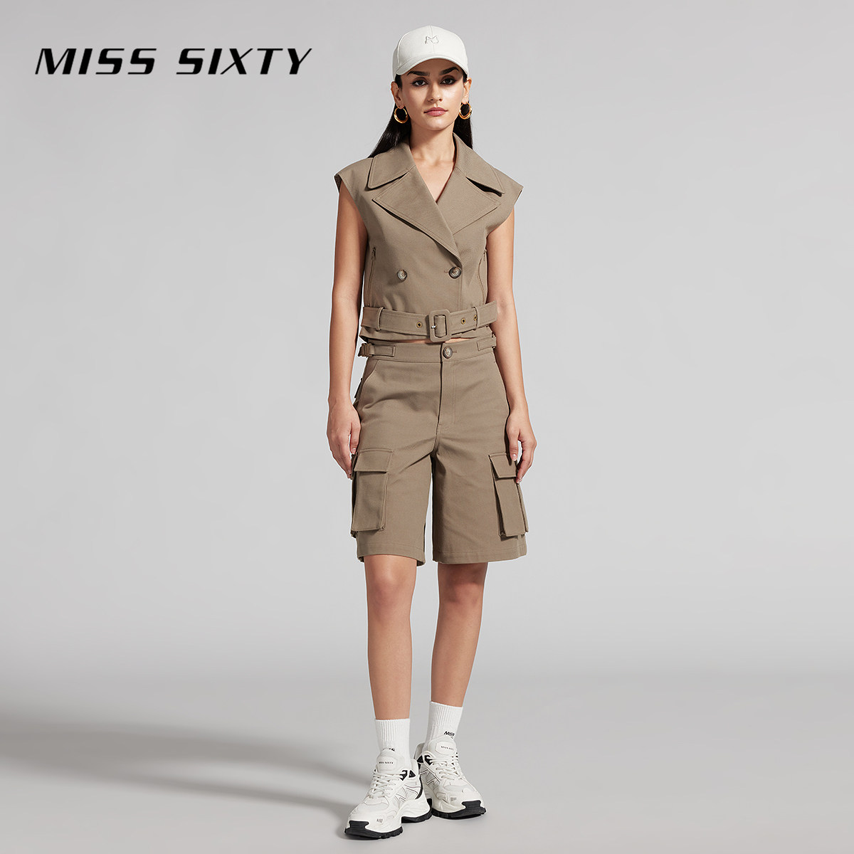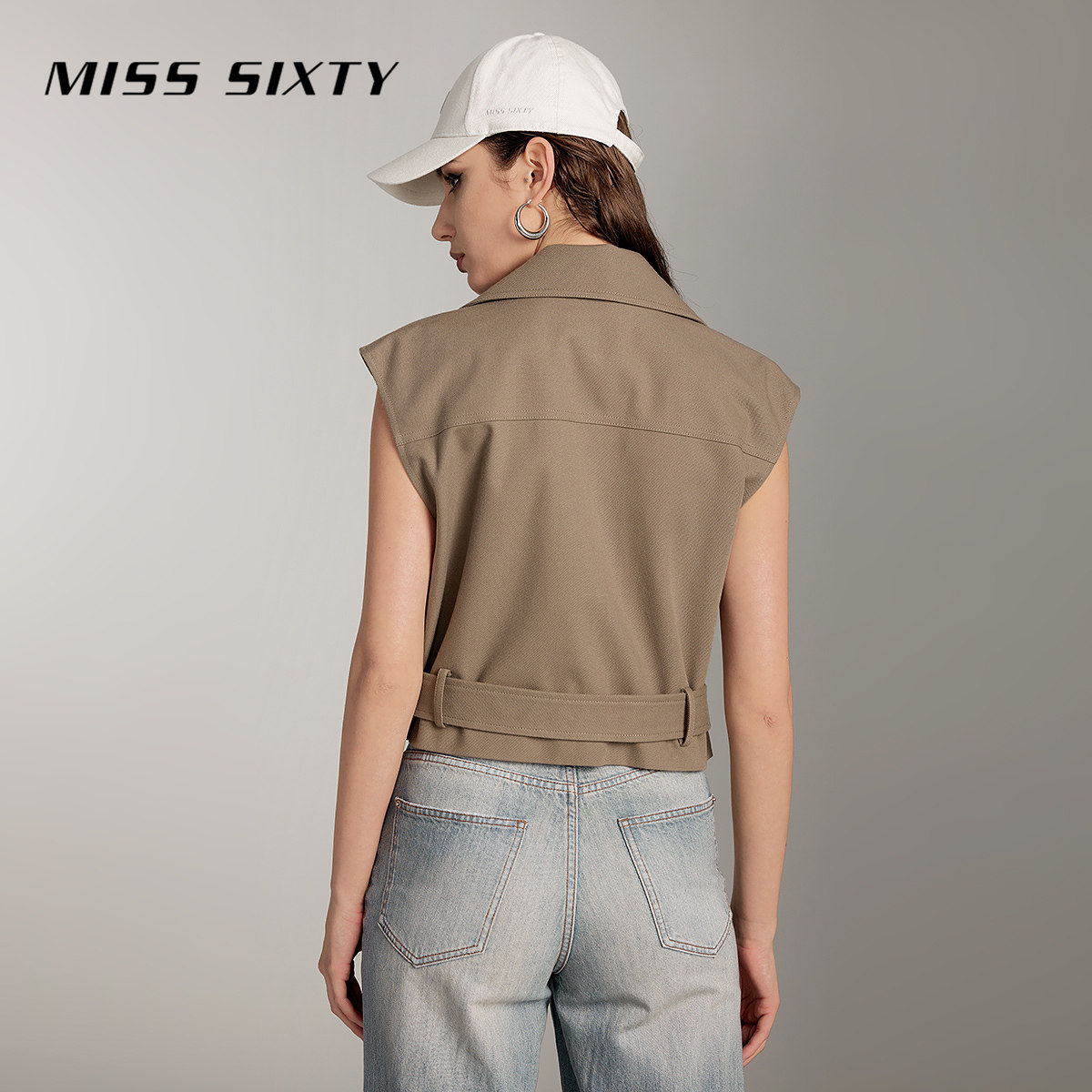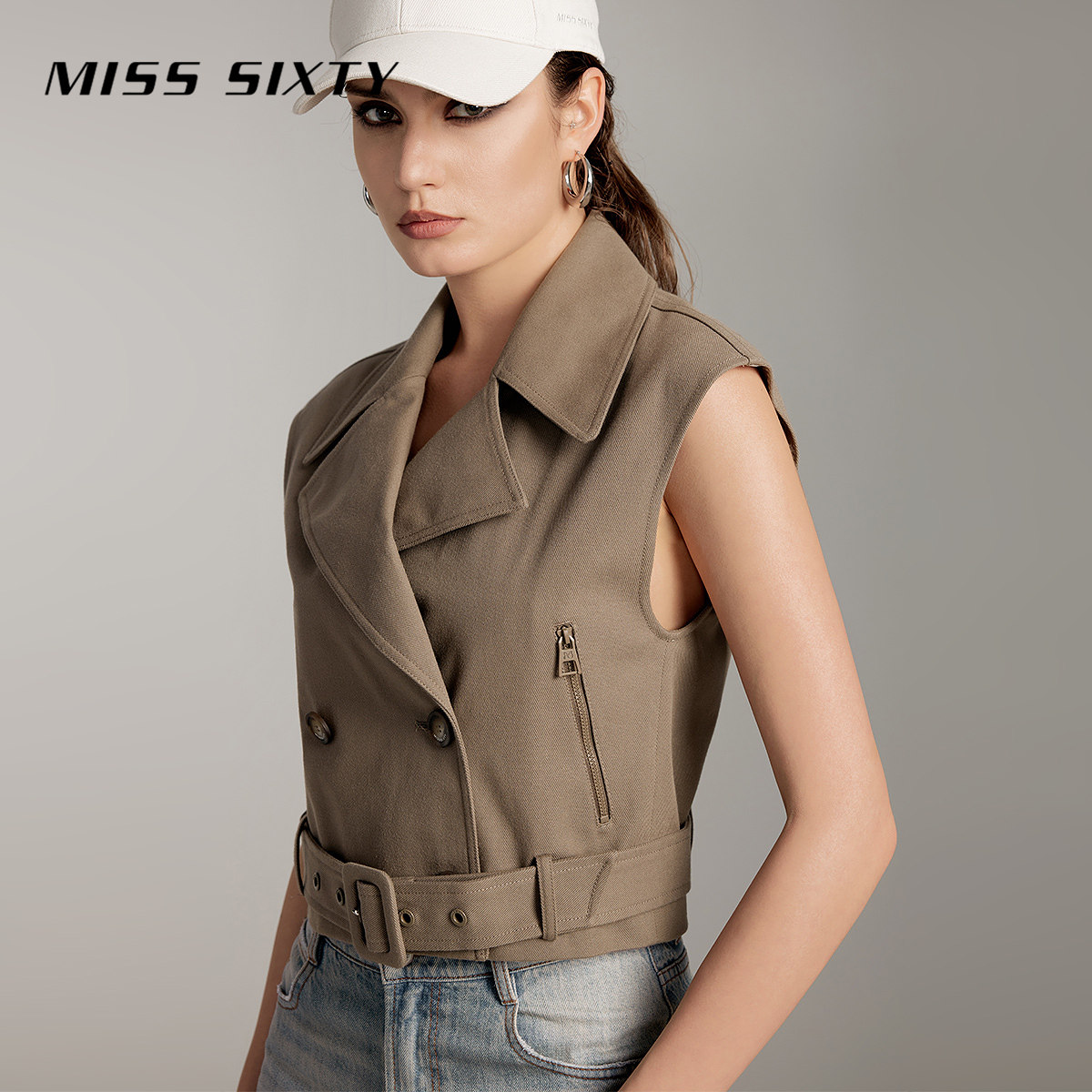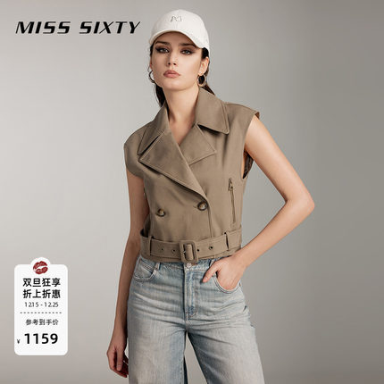 Miss Sixty卡其色马甲女复古双排扣西装领通勤无袖气质街头背心