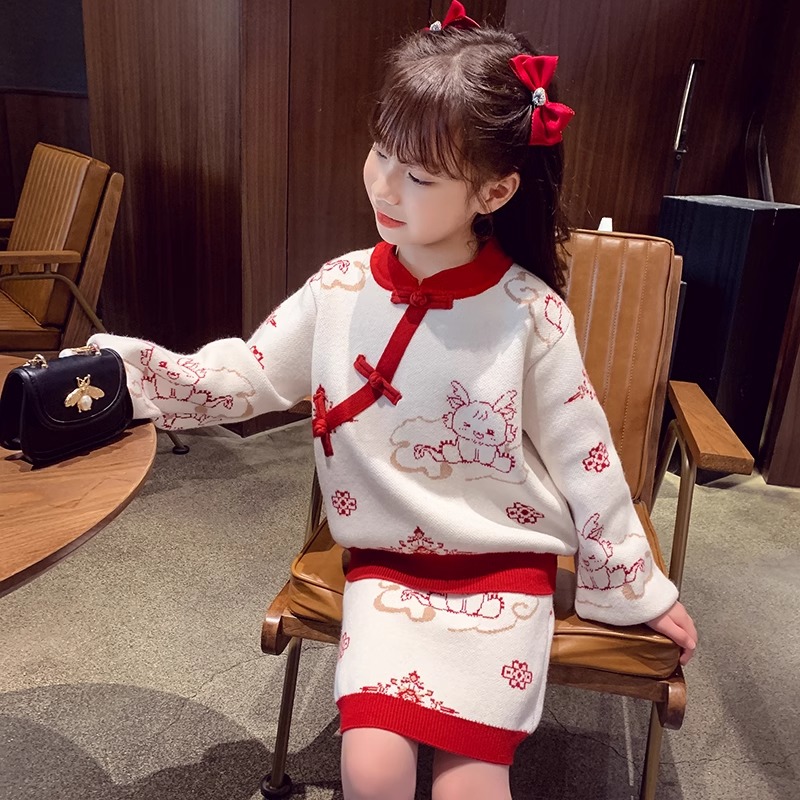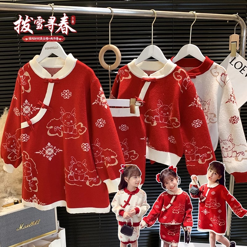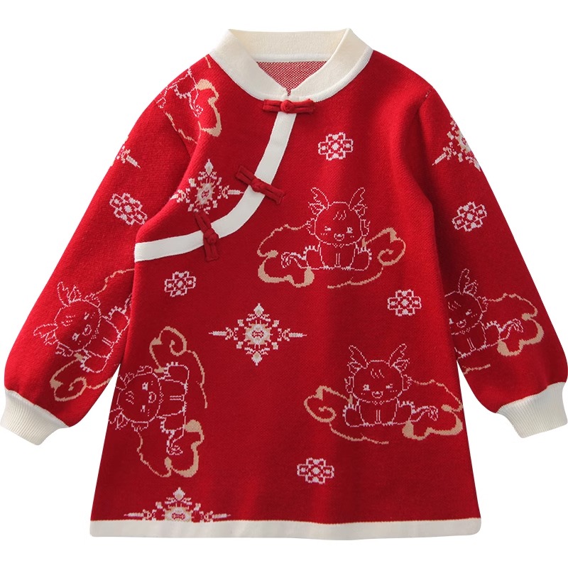 女童中国风针织连衣裙春秋2025新款小女孩洋气公主裙新年拜年衣服