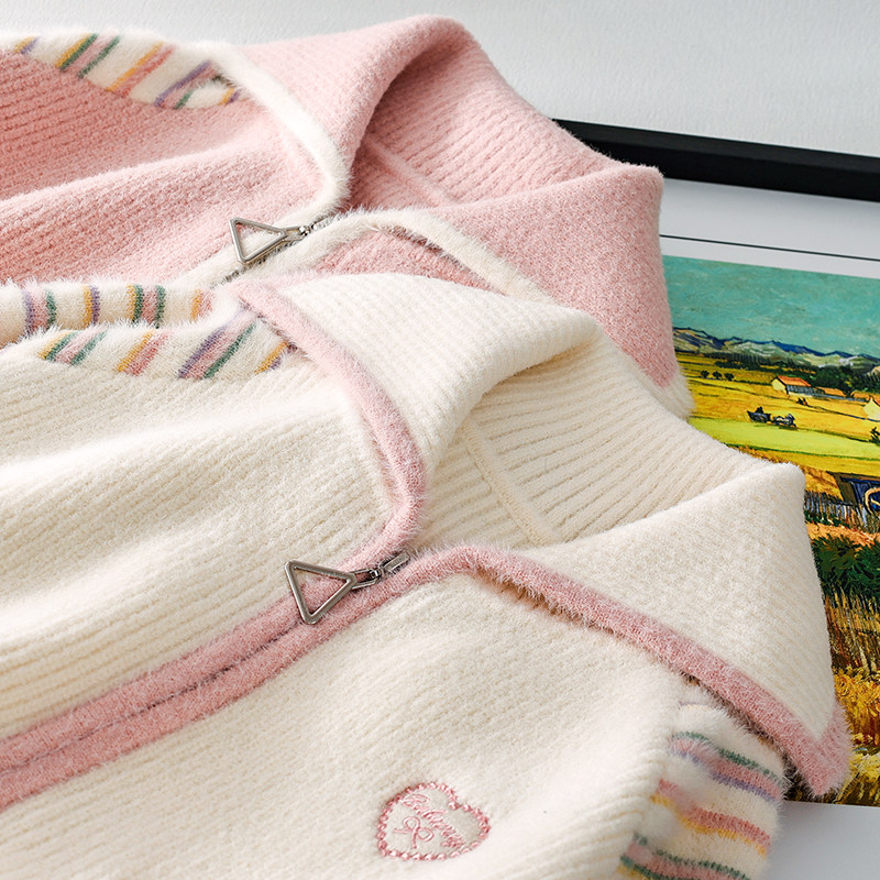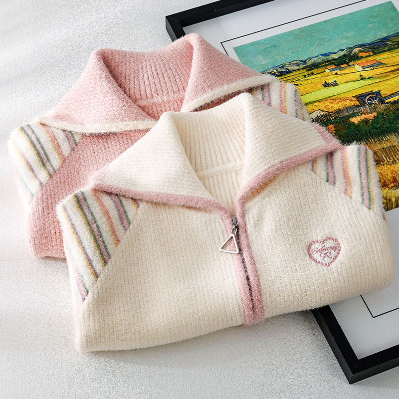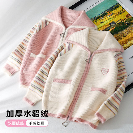 女童针织外套春秋款洋气童装儿童仿水貂绒拉链开衫大童翻领毛线衣