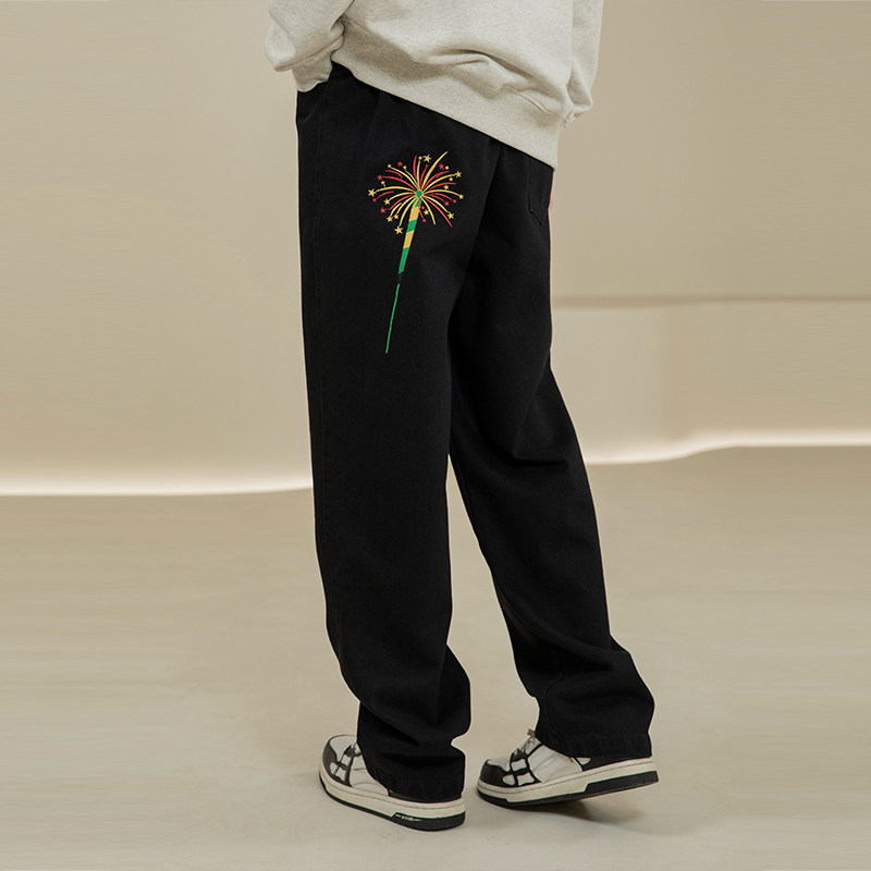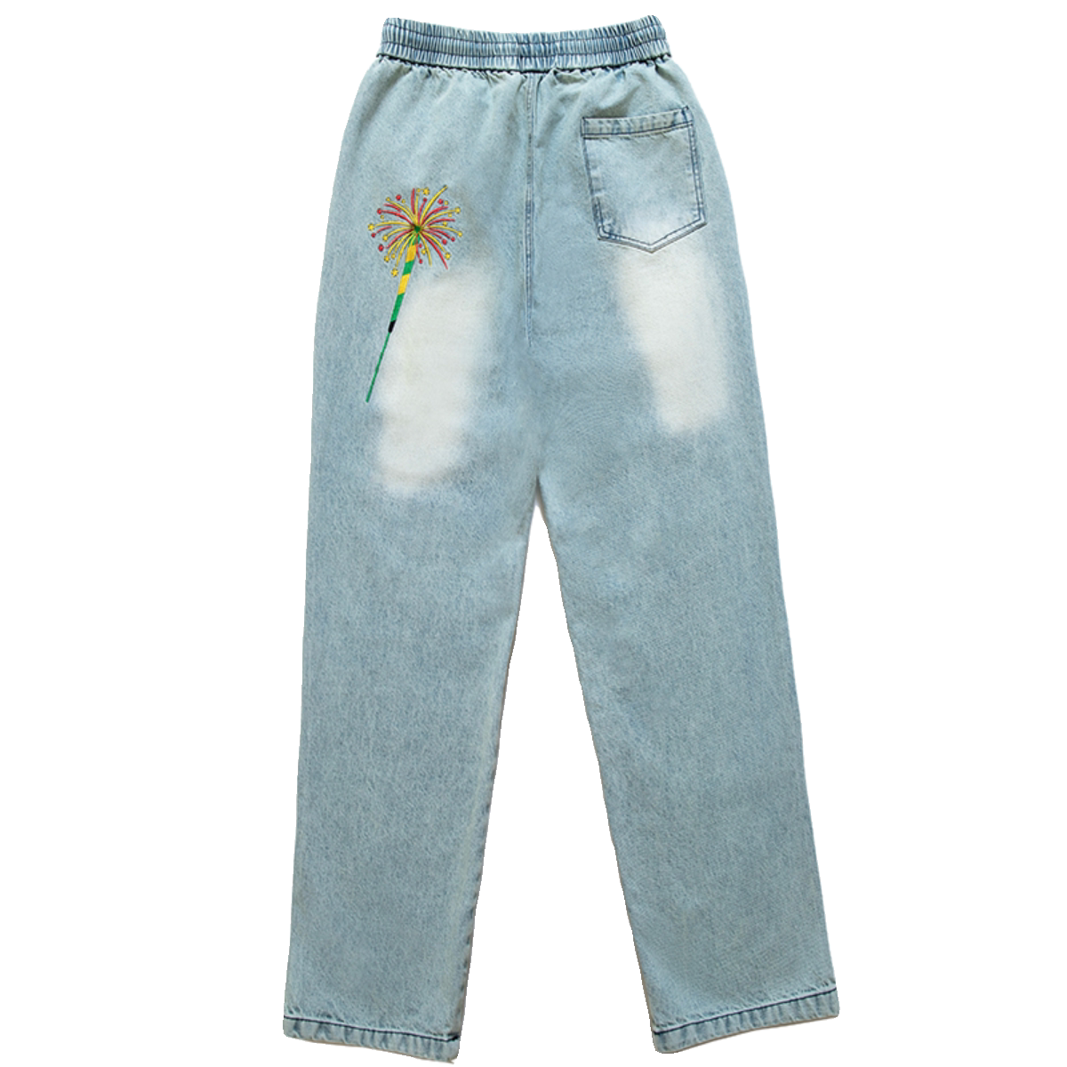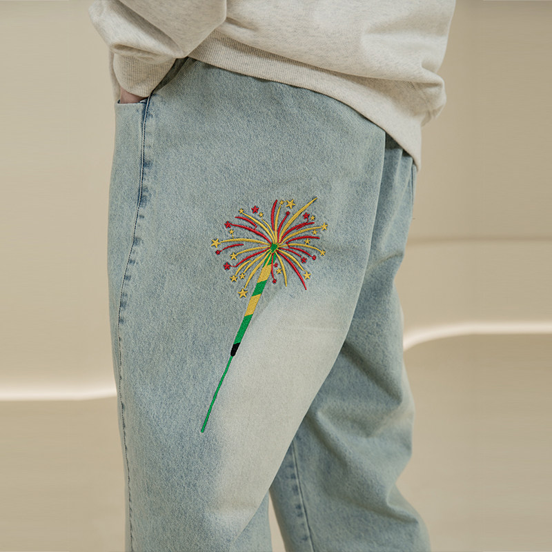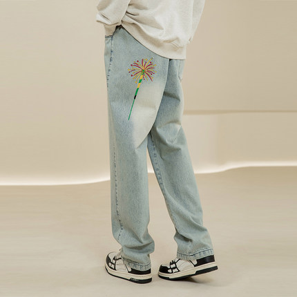 烦恼的Octopusl美式烟花刺绣牛仔裤直筒水洗蓝色宽松百搭长裤子男