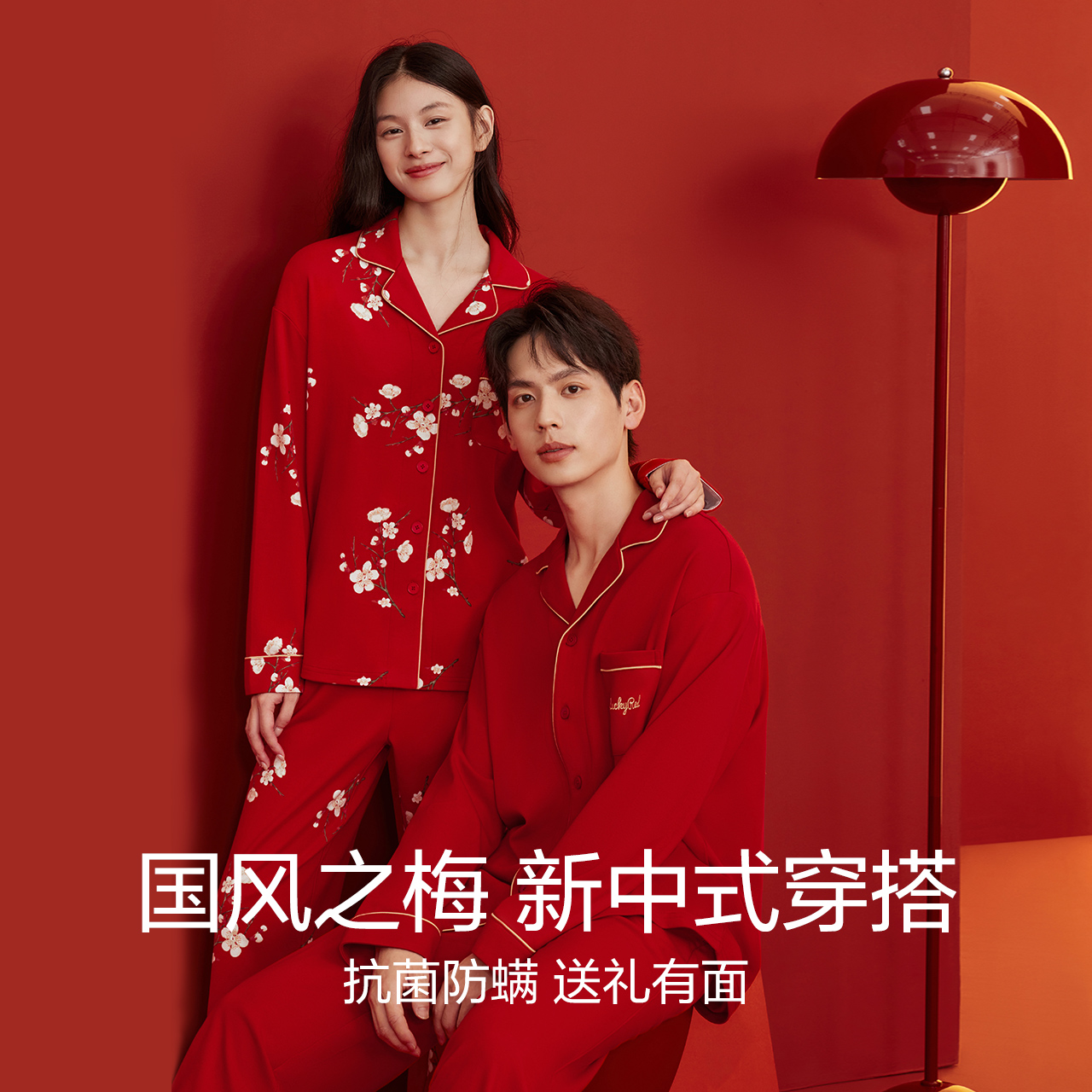 红豆红色睡衣纯棉长袖本命年结婚国风抗菌防螨A类男女家居服套装