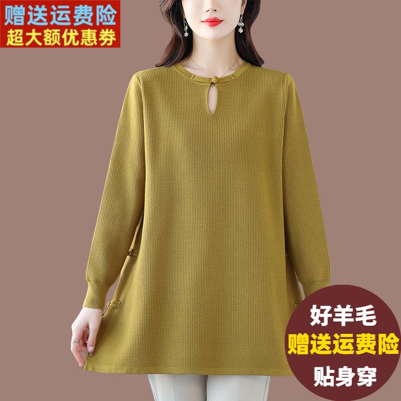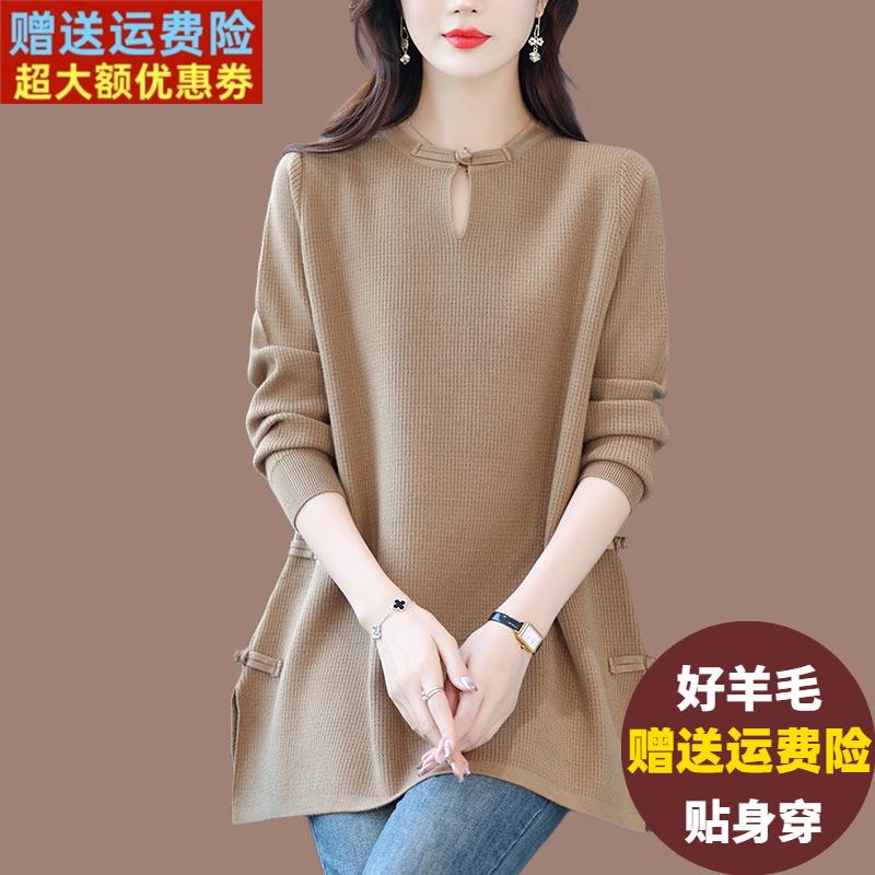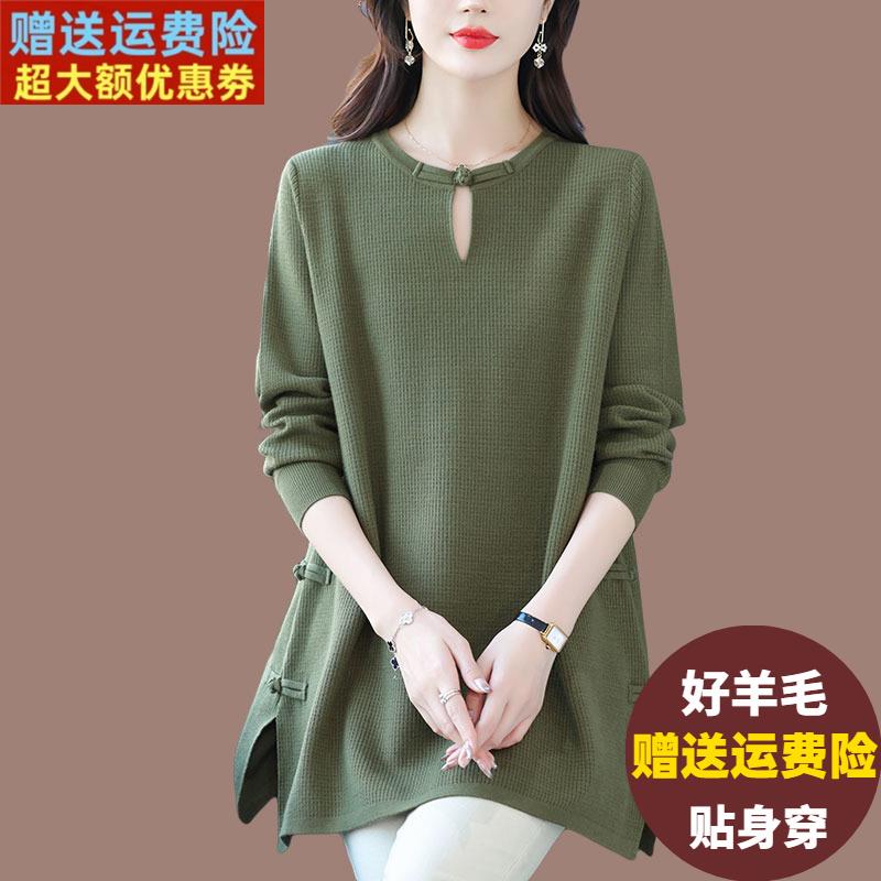 大码女装羊毛衫秋冬洋气复古国风盘扣毛衣裙中长款遮肚显瘦羊绒衫
