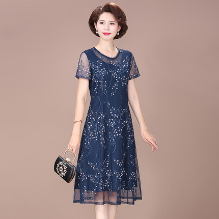 时尚妈妈装夏季连衣裙中老年女装新款洋气质高贵夫人蕾丝刺绣裙子
