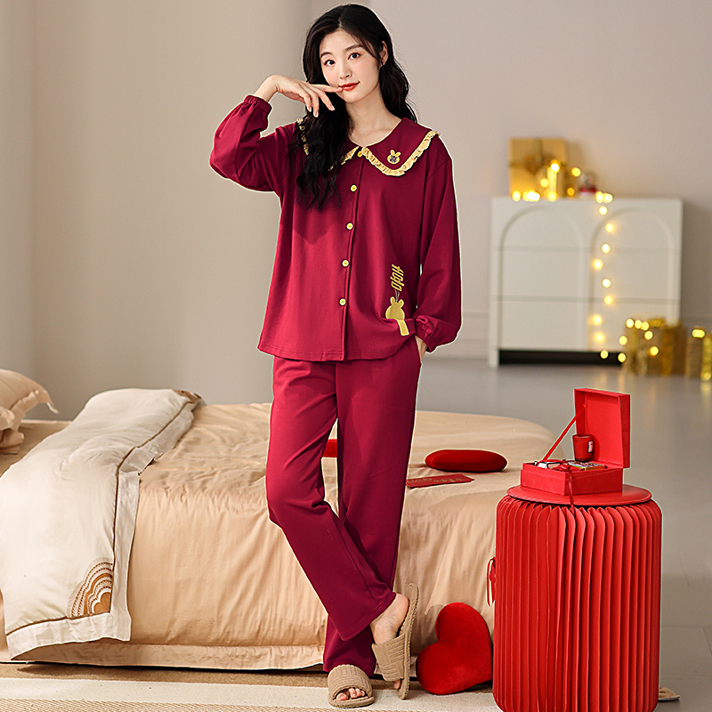 猫人情侣睡衣女秋冬季长袖纯棉大红色本命年结婚新婚可外穿家居服