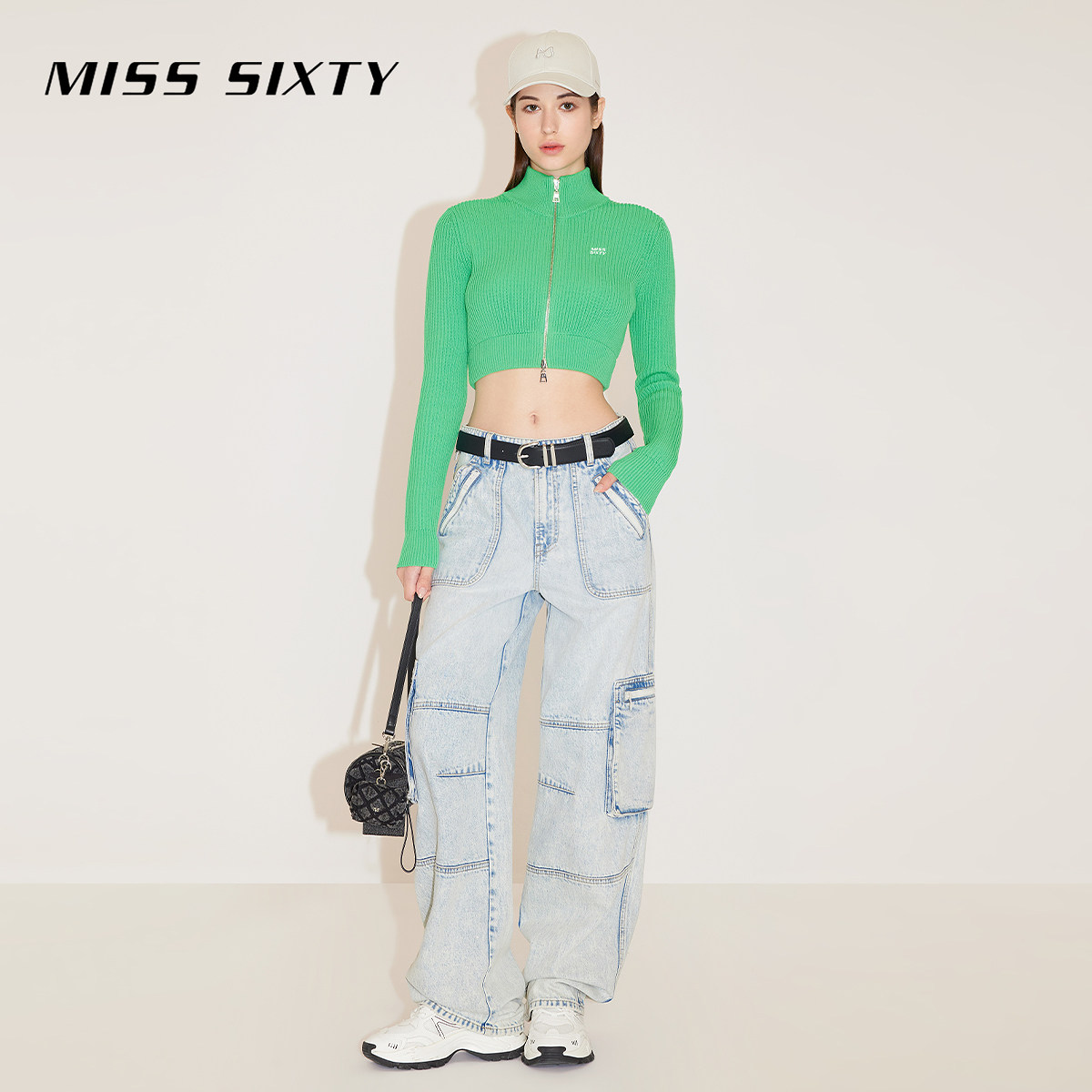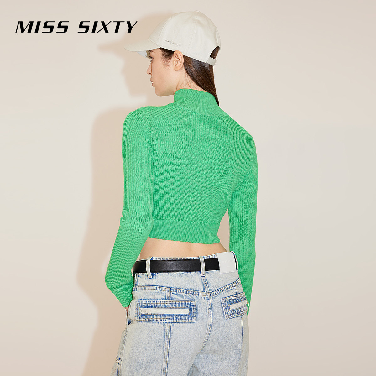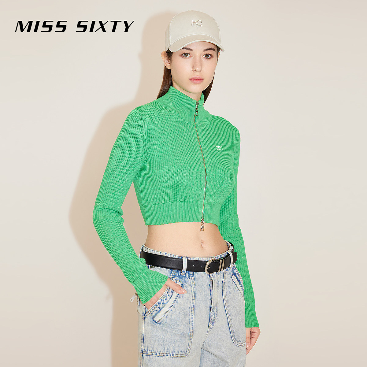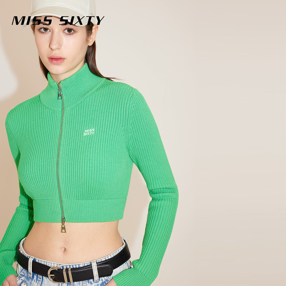 Miss Sixty含桑蚕丝针织衫女立领修身短款双拉链时尚露脐上衣毛衣