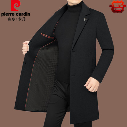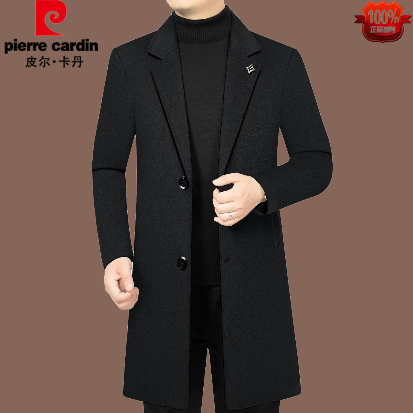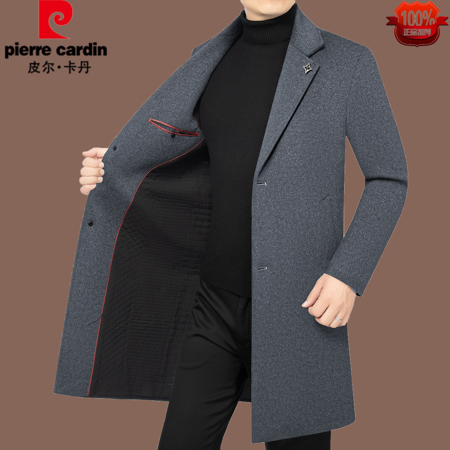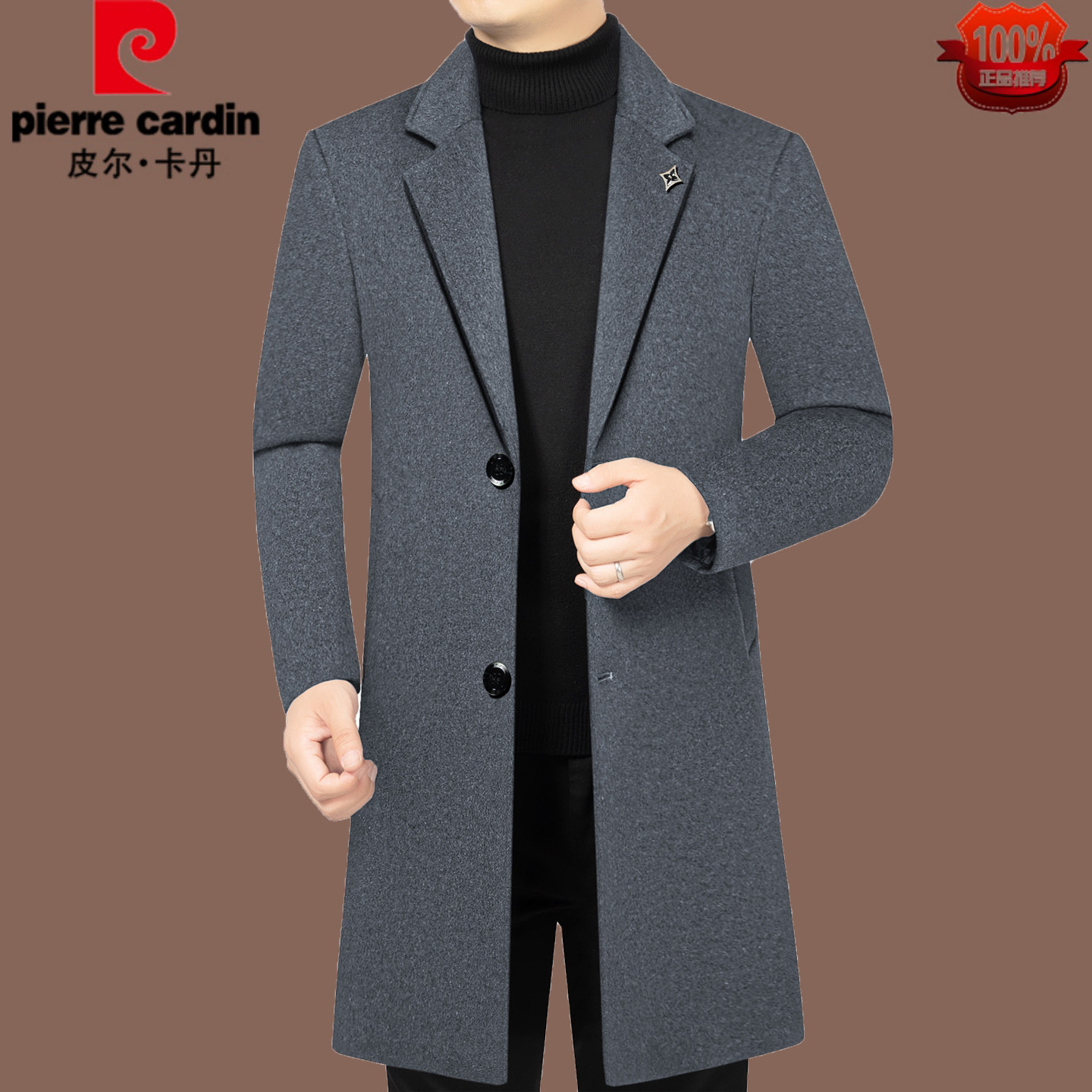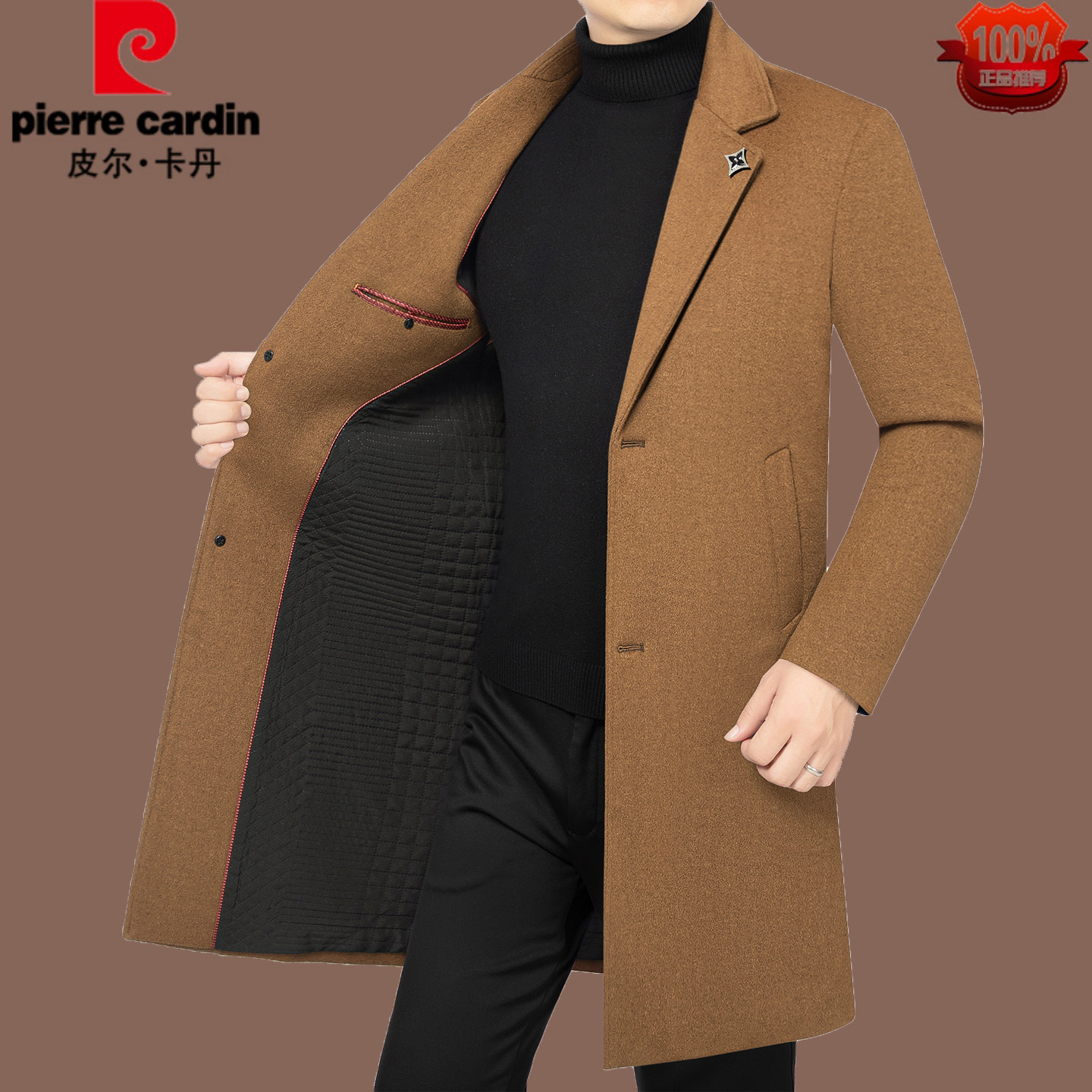 皮尔卡丹秋冬款羊毛呢夹克中年男士加厚中长款西装领风衣高档大衣