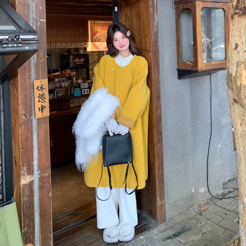 黄色超好看羊羔毛外套女韩系奶fufu减龄中长款皮毛一体颗粒绒大衣
