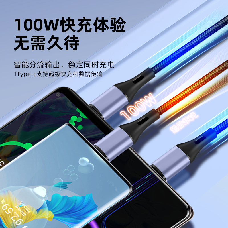 胖头雕100W三合一充电器超级快充一拖三手机数据线typec充电线车载多头适用苹果平板安卓华为1.5米多功能三头