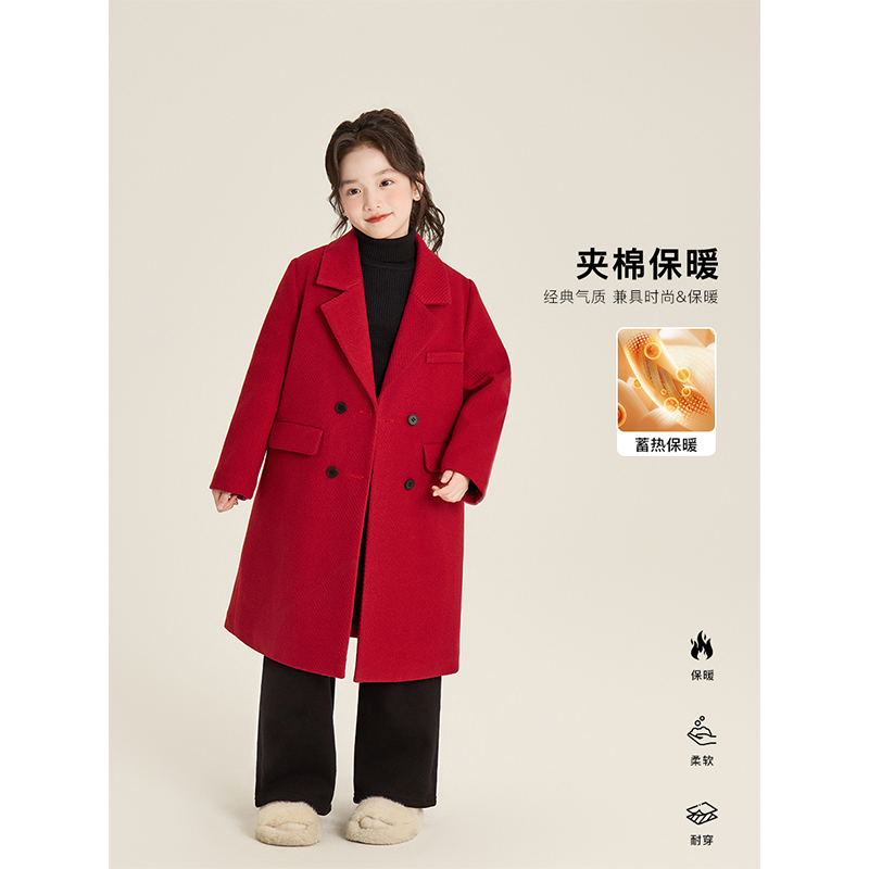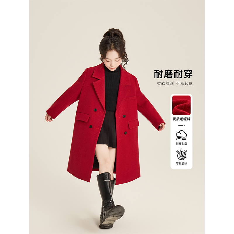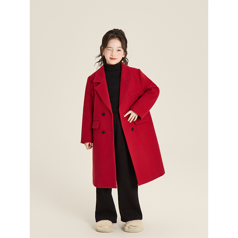 Amybaby女童外套冬季2025新款加厚百搭单排扣双面羊绒毛呢大衣