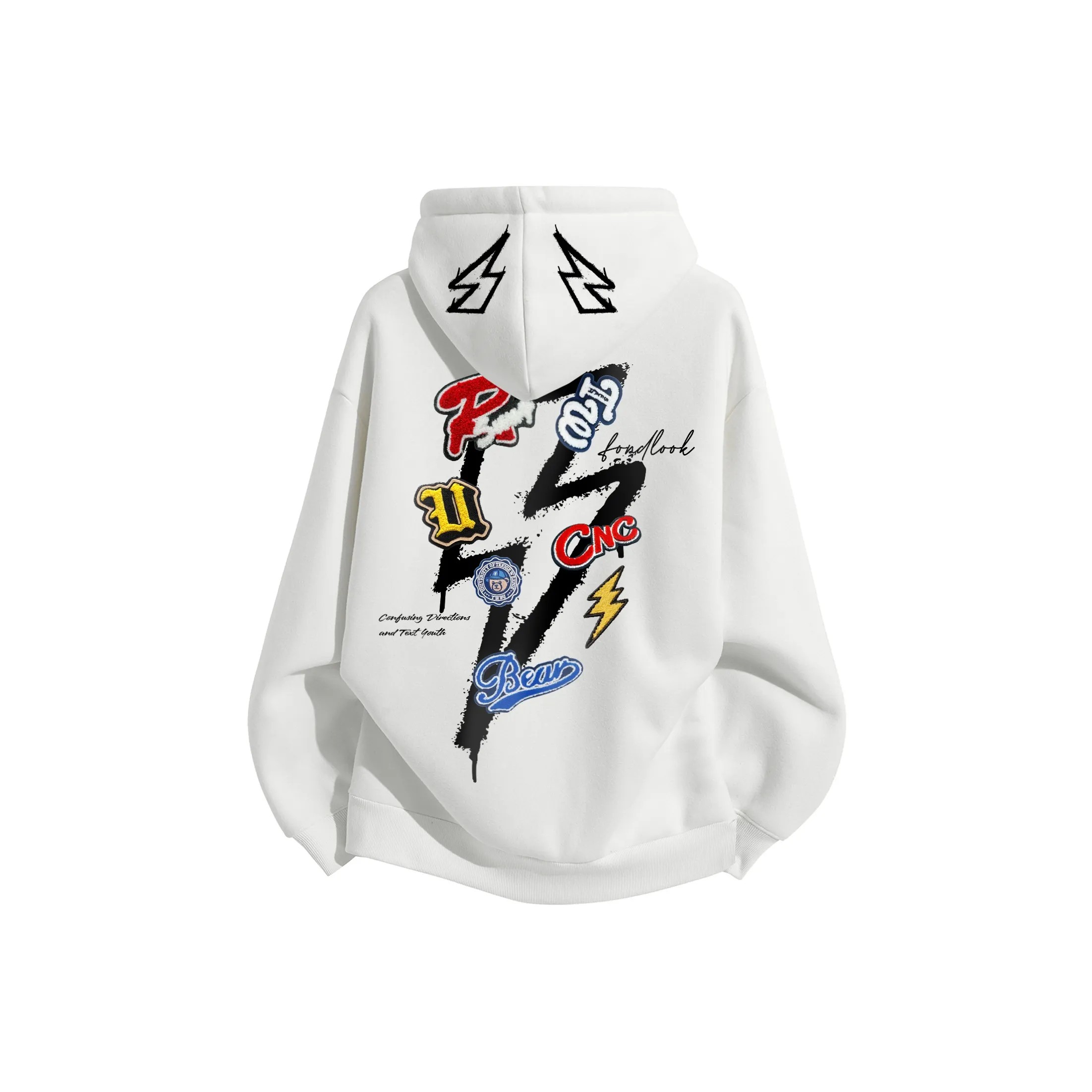 FONDLOOK 美式复古高街潮流创意涂鸦闪电字母印花Logo连帽卫衣