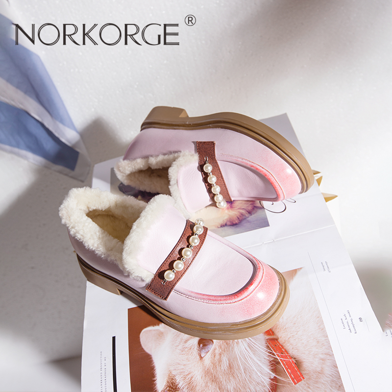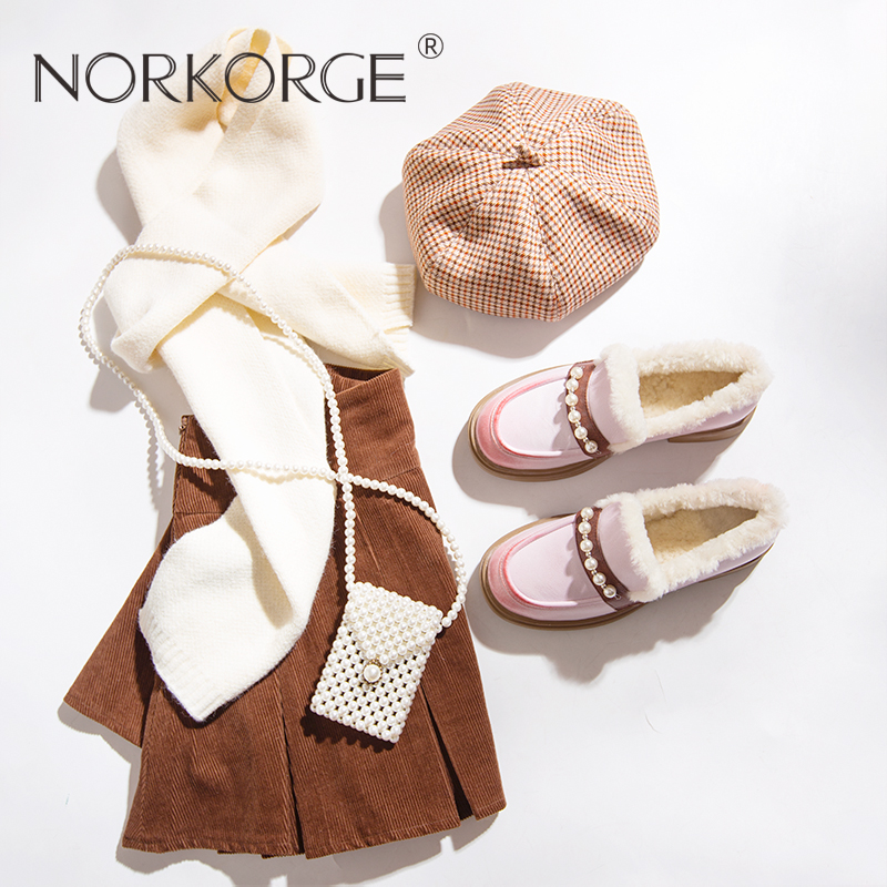 原创新款手工复古甜美蜜桃粉羊毛乐福鞋女鞋真皮圆头毛毛鞋2025