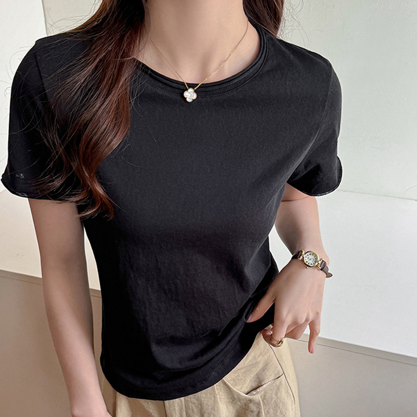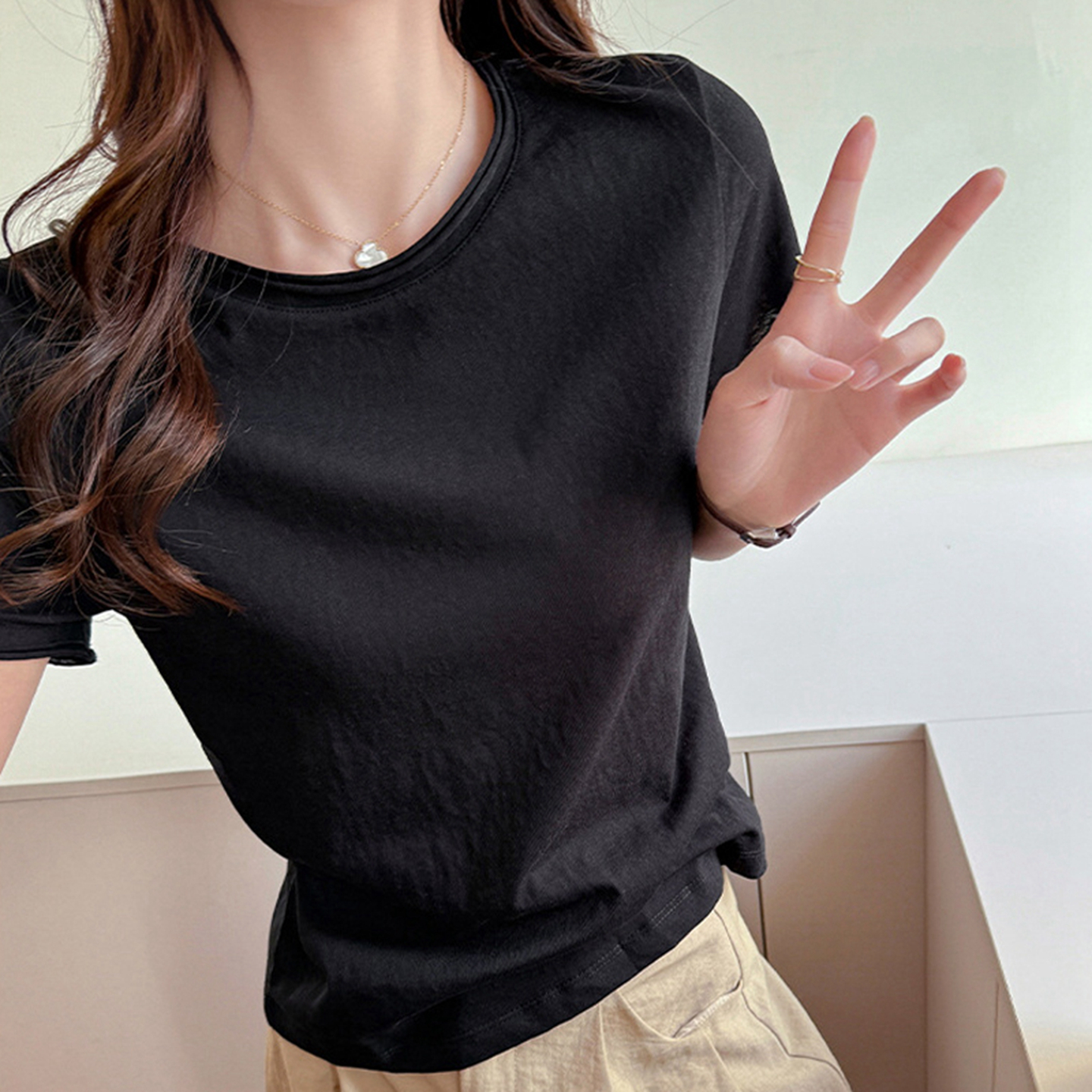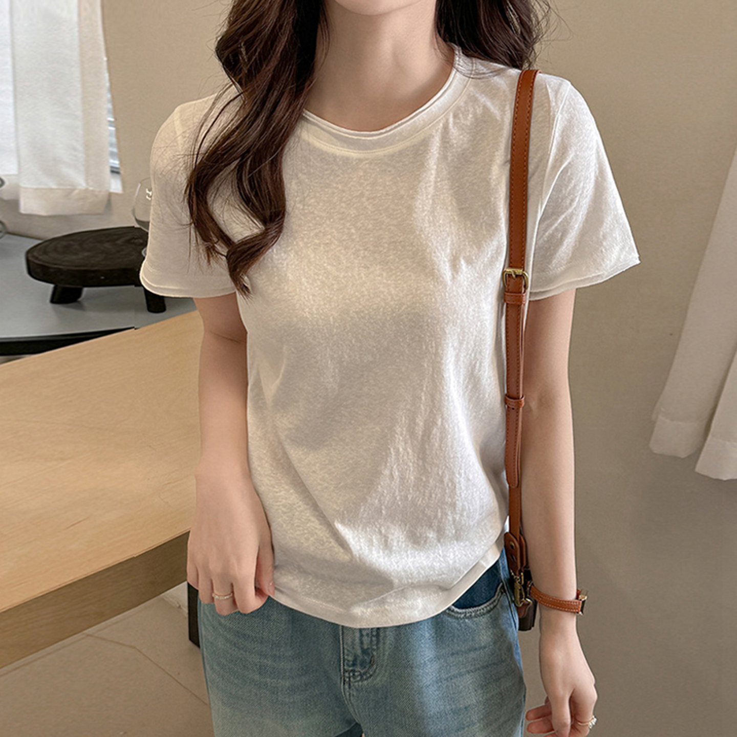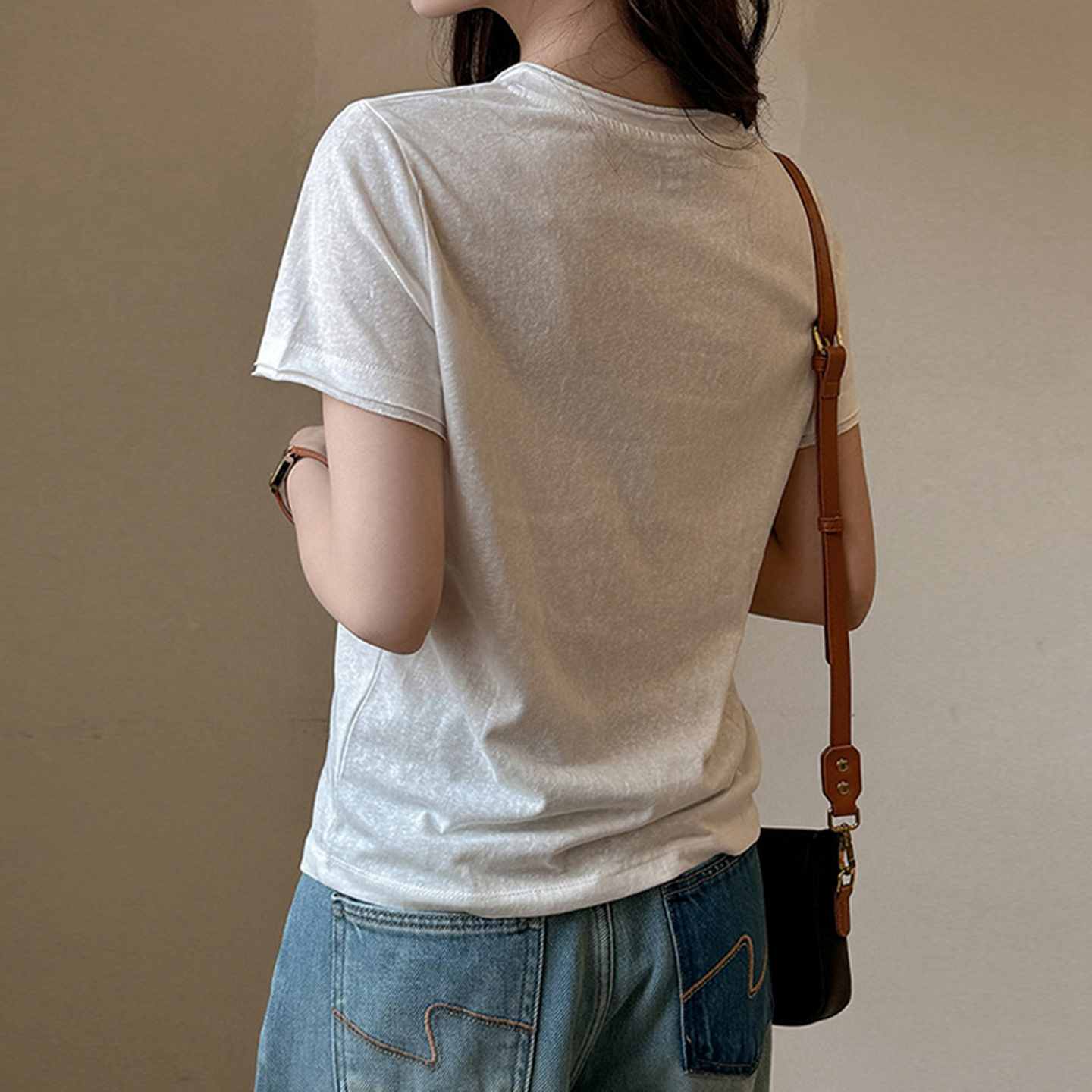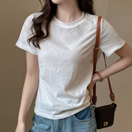 韩版雪花棉麻短袖T恤女夏宽松慵懒卷边圆领内搭上衣正肩打底衫ins