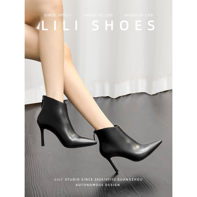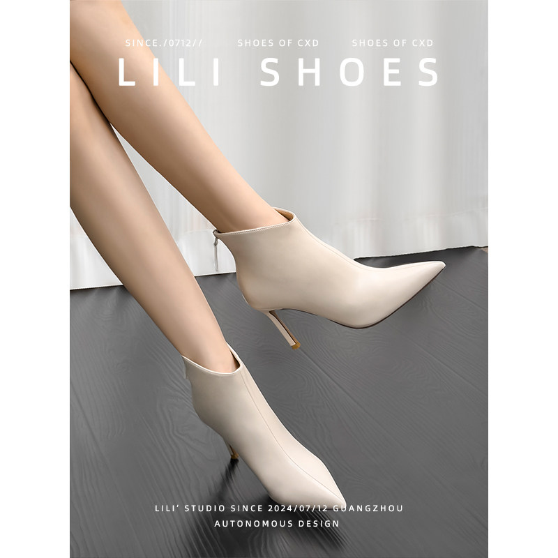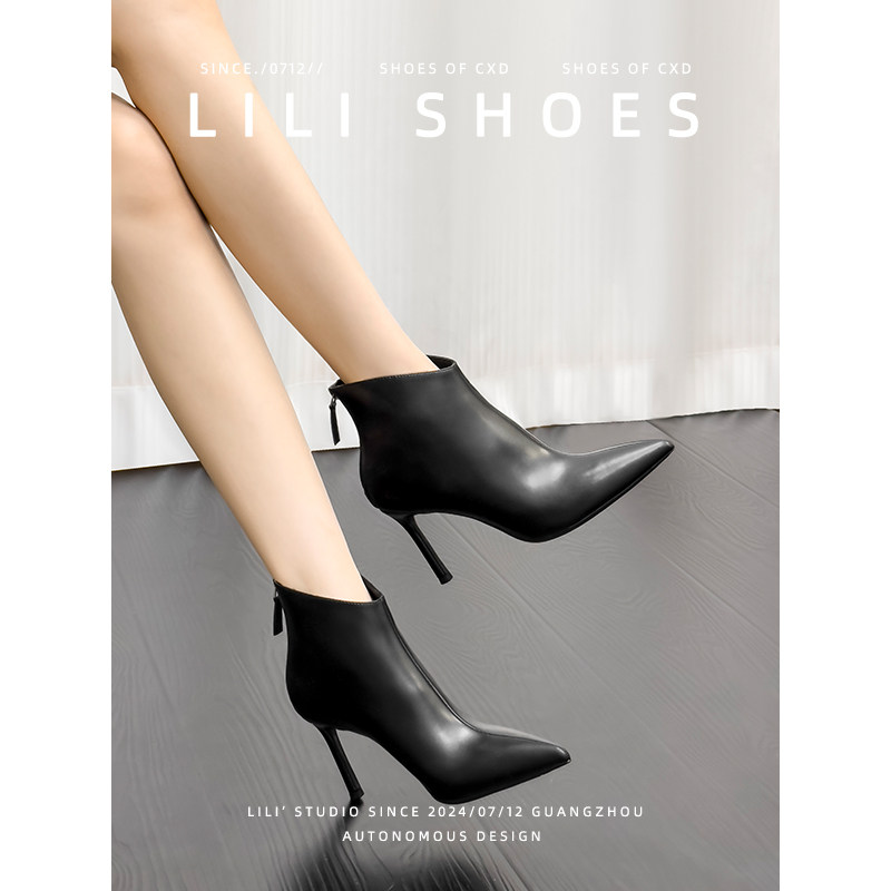高跟鞋后拉链短靴女秋冬季新款单靴细跟尖头及裸靴短筒加绒半靴子