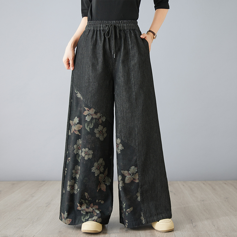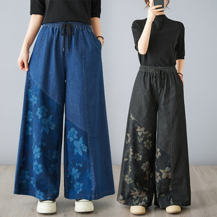 春季新款复古文艺拼接高腰显瘦休闲大码女阔腿牛仔裤蓝色松紧腰