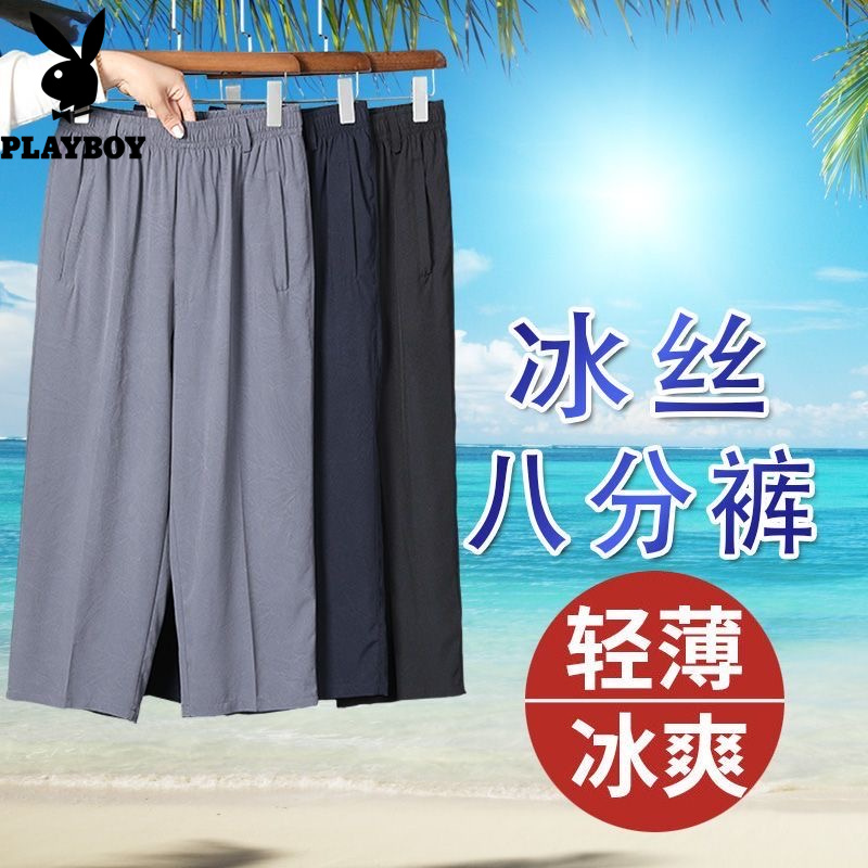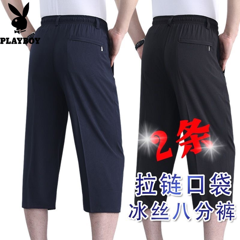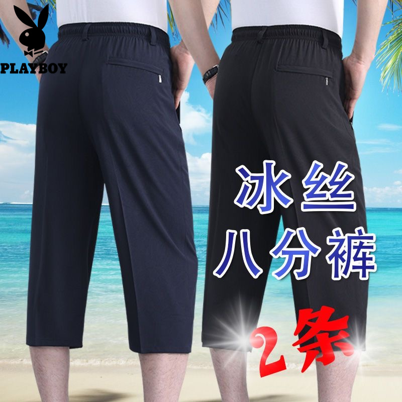 花花公子夏季冰丝男士中老年八分老人宽松松紧短裤爸爸中裤休闲裤